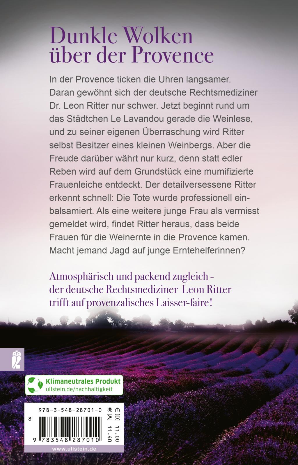 In der Provence ticken die Uhren anders. Daran gewöhnt sich der deutsche Rechtsmediziner Dr. Leon Ritter nur langsam. Dabei beginnt rund um das Städtchen Le Lavandou gerade die Weinlese und zu seiner eigenen Überraschung wird Ritter selbst Besitzer eines kleinen Weinbergs. Aber die Freude darüber währt nur kurz, denn statt edler Reben wird auf dem Grundstück eine mumifizierte Frauenleiche entdeckt. Der detailversessene Ritter erkennt schnell: Die Tote wurde professionell einbalsamiert. Als eine weitere junge Frau als vermisst gemeldet wird, findet Ritter heraus, dass beide Frauen für die Weinernte in die Provence kamen. Macht jemand Jagd auf die jungen Frauen? Um Antworten auf seine Fragen zu bekommen, muss Leon erst weit in die Vergangenheit zurückgehen.
