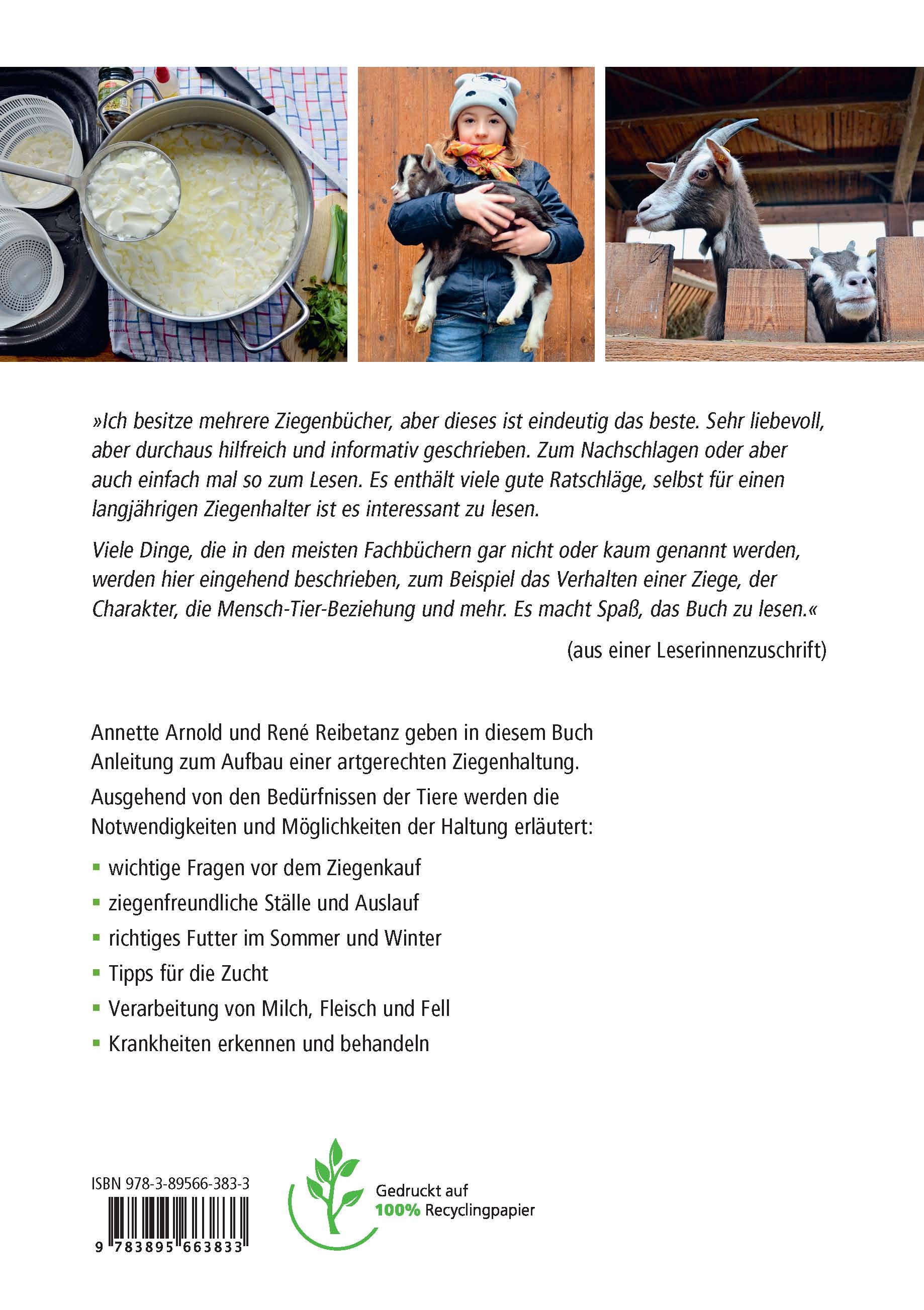 Ein ausdrucksstarkes Bild der Ziege zeichnen Annette Arnold und René Reibetanz in diesem Buch. Im Vordergrund stehen Intelligenz und Geschicklichkeit der Ziege, die mühelos Gräben überspringt und Schluchten erklimmt. Die Autoren stellen die bekanntesten Rassen vor und geben Anleitung zum Aufbau einer artgerechten Ziegenhaltung. Ausgehend von den Bedürfnissen der Tiere werden die Notwendigkeiten und Möglichkeiten der Haltung erläutert: