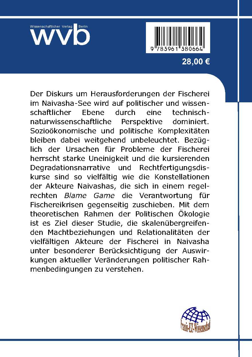 Der Diskurs um Herausforderungen der Fischerei im Naivasha-See wird auf politischer und wissenschaftlicher Ebene durch eine technisch-naturwissenschaftliche Perspektive dominiert. Sozioökonomische und politische Komplexitäten bleiben dabei weitgehend unbeleuchtet. Bezüglich der Ursachen für Probleme der Fischerei herrscht starke Uneinigkeit und die kursierenden Degradationsnarrative und Rechtfertigungsdiskurse sind so vielfältig wie die Konstellationen der Akteure Naivashas, die sich in einem regelrechten Blame Game die Verantwortung für Fischereikrisen gegenseitig zuschieben. Mit dem theoretischen Rahmen der Politischen Ökologie ist es Ziel dieser Studie, die skalenübergreifenden Machtbeziehungen und Relationalitäten der vielfältigen Akteure der Fischerei in Naivasha unter besonderer Berücksichtigung der Auswirkungen aktueller Veränderungen politischer Rahmenbedingungen zu verstehen.