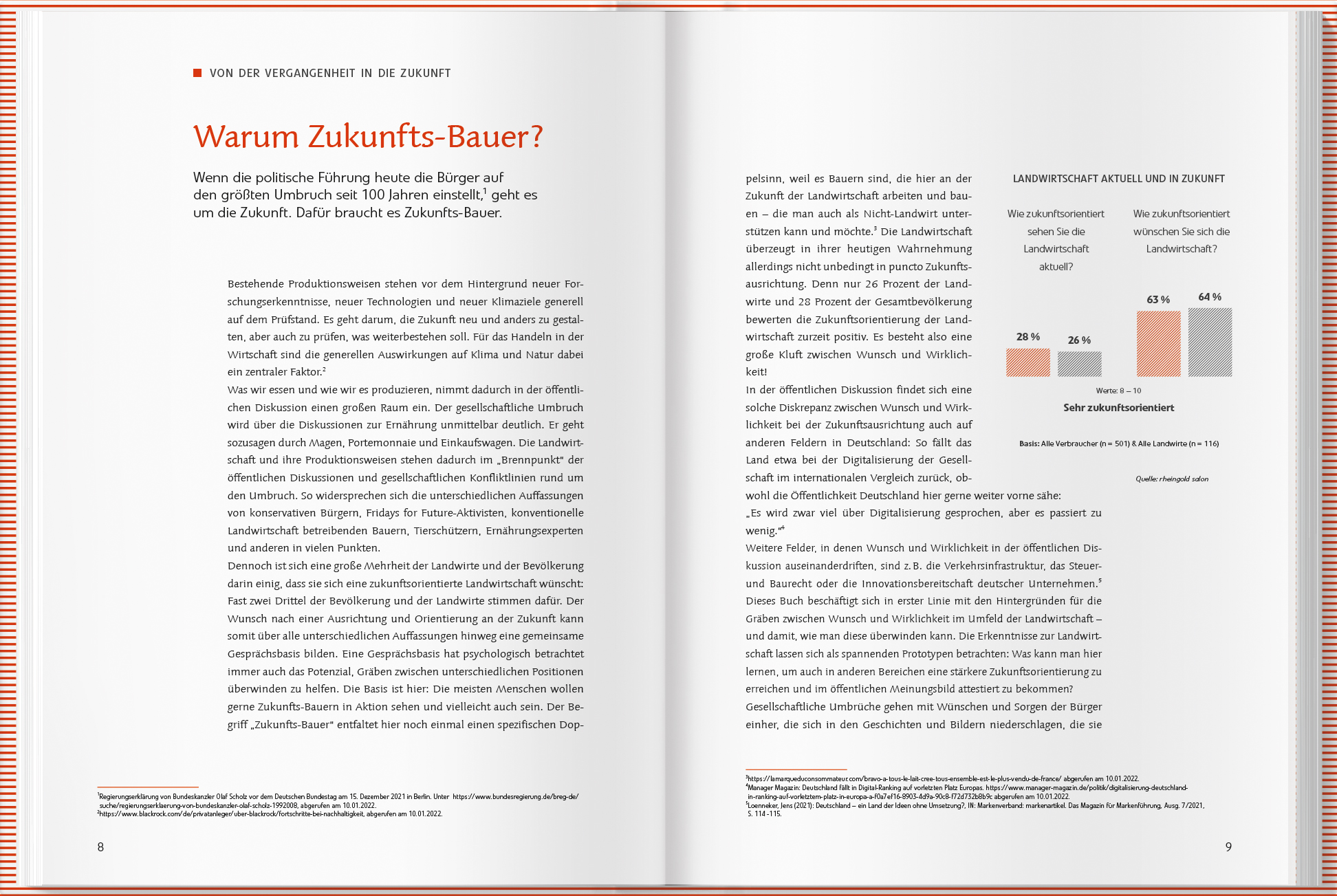 Die Bundesregierung stellt die Bürger auf eine Zeitenwende und den größten Umbruch seit 100 Jahren ein. Wie kommen wir jedoch in eine gut gestaltete Zukunft, wenn Misstrauen und Fake News immer wieder die öffentliche Diskussion gegenüber allen Veränderungen und Neuerungen prägen? Und wie lässt sich in der heutigen Zeit wieder mehr Vertrauen in der öffentlichen Meinungsbildung erreichen? Diesen Fragen gehen die Autoren Jens Lönneker, Marco Diefenbach und Lukas Struwe von der Markt- und Medienforschungsagentur rheingold salon in ihrem Buch "Zukunfts-Bauer - Über die Analyse und Gestaltung des öffentlichen Vertrauens" am Beispiel der Landwirtschaft nach.