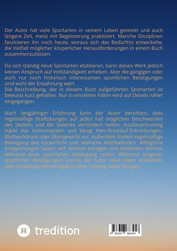Der Autor hat viele Sportarten in seinem Leben getestet und auch längere Zeit, meist mit Begeisterung praktiziert. Manche Disziplinen faszinieren ihn noch heute, woraus sich das Bedürfnis entwickelte, die Vielfalt möglicher körperlicher Herausforderungen in einem Buch zusammenzufassen. Da sich ständig neue Sportarten etablieren, kann dieses Werk jedoch keinen Anspruch auf Vollständigkeit erheben. Aber die gängigen oder auch nur noch historisch interessanten sportlichen Betätigungen sind wohl der Erwähnung wert.Die Beschreibung, der in diesem Buch aufgeführten Sportarten ist bewusst kurz gehalten. Nur in einzelnen Fällen wird auf Details näher eingegangen. Nach langjähriger Erfahrung kann der Autor berichten, dass regelmäßige Kraftübungen auf jeden Fall möglichen Beschwerden des Skeletts und der Gelenke verhindern helfen. Ausdauertraining stärkt das Immunsystem und beugt Herz-Kreislauf-Erkrankungen, Bluthochdruck oder Übergewicht vor. Außerdem fördert regelmäßige Bewegung das körperliche und seelische Wohlbefinden. Alltägliche Anspannungen lassen sich leichter ertragen und Gedanken können während einer sportlichen Betätigung reifen. Während längeren sportlichen Betätigungen konnte der Autor neue Ideen entwickeln oder schwierige Denkaufgaben einer Lösung näher bringen.