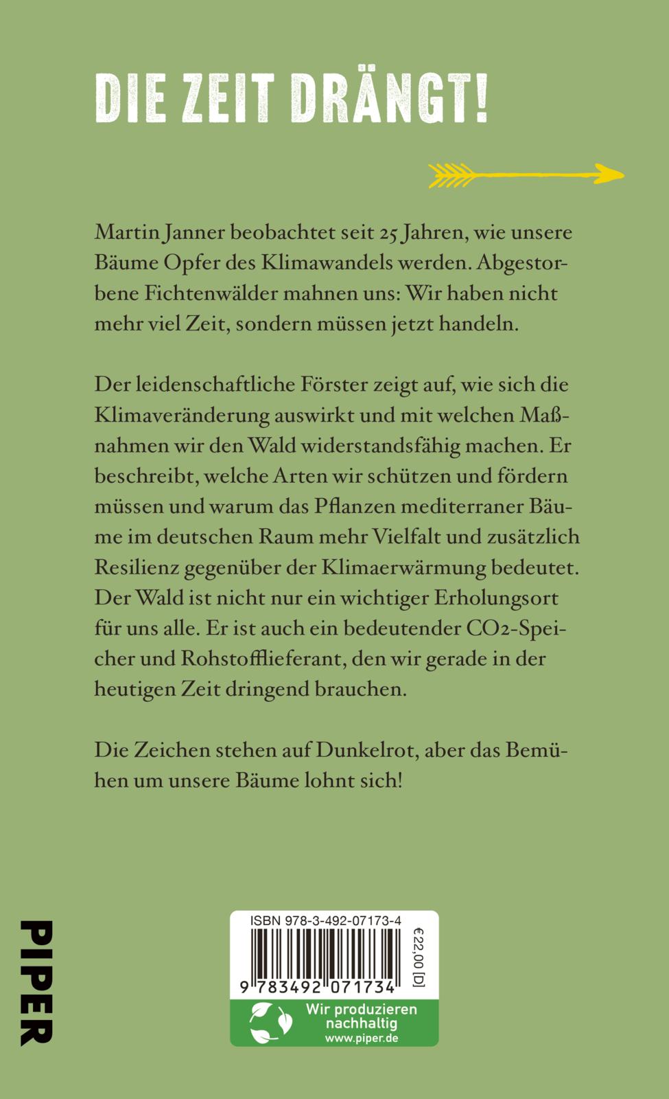 Förster Martin Janner beobachtet seit 25 Jahren, wie unsere Bäume Opfer des Klimawandels werden. Durch abgestorbene Fichtenwälder entstandene Freiflächen machen klar: Es müssen jetzt Entscheidungen getroffen werden. In seinem Buch erzählt er, wie sich die Klimaveränderung auswirkt und mit welchen Maßnahmen wir den Wald widerstandsfähig machen. Denn ohne den Wald fehlt uns nicht nur ein bedeutender CO2-Speicher und Erholungsort, gerade als Rohstofflieferant ist er in der heutigen Zeit keineswegs zu unterschätzen.