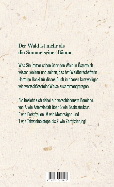 Der Wald ist mehr als die Summe seiner Bäume! Was Sie immer schon über den Wald in Österreich wissen wollten und sollten, das hat die Waldbotschafterin Hermine Hackl für dieses Buch in ebenso kurzweiliger wie wertschätzender Weise zusammengetragen. Sie stellt den Wald von A bis Z vor und bezieht sich dabei auf verschiedenste Bereiche wie Gesundheit und Sport, Brauchtum und Religion, Tourismus und Kulinarik, Kunst und Kultur, Natur, Wissenschaft und Bildung, Mode und Technik, Forstfrauen und Waldbesitzer*innen. Das Buch gibt faszinierende Einblicke in einen Sektor, der Österreich durch seine Wirtschafts- und Identifikationskraft maßgeblich geprägt hat und der auch in Zukunft ein wichtiger Faktor für Wohlstand und Klimaschutz in unserem Land sein wird.Von A wie Arterhaltung über B wie Besitzverhältnisse, F wie Forstfrauen, M wie Motorsägenführerschein und T wie Trittsteinbiotope bis Z wie Zeiträume, in denen die Forstwirtschaft denkt.Wussten Sie zum Beispiel, dass ...- der Forsthelm eines österreichischen Herstellers sogar von der ESA verwendet wird?- einige Orchester von internationalem Rang ihr Geigenharz von österreichischen Pechern beziehen?- österreichische Stoffe aus Buchenholz weltweit auf den Laufstegen zu finden sind?- die erste Forstakademikerin der Welt eine Österreicherin war?Was Sie schon immer über den heimischen Wald erfahren wollten und sollten!So vielfältig und wichtig ist das Naturwunder Wald - Erstaunliches und Wissenswertes