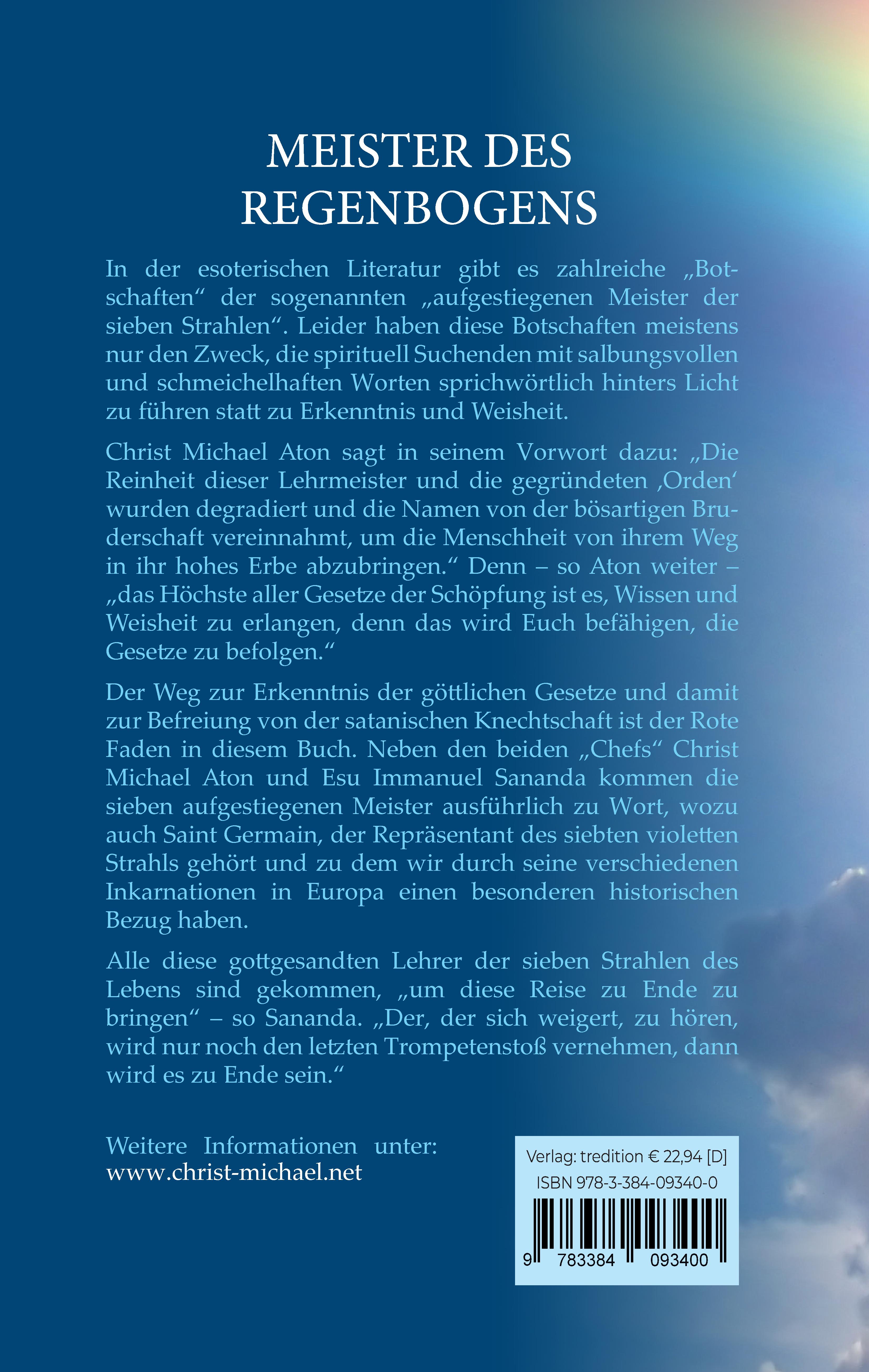 In der esoterischen Literatur gibt es zahlreiche "Botschaften" der sogenannten "aufgestiegenen Meister der sieben Strahlen". Leider haben diese Botschaften meistens nur den Zweck, die spirituell Suchenden mit salbungsvollen und schmeichelhaften Worten sprichwörtlich hinters Licht zu führen statt zu Erkenntnis und Weisheit. Christ Michael Aton sagt in seinem Vorwort dazu: "Die Reinheit dieser Lehrmeister und die gegründeten ,Orden' wurden degradiert und die Namen von der bösartigen Bruderschaft vereinnahmt, um die Menschheit von ihrem Weg in ihr hohes Erbe abzubringen." Denn - so Aton weiter - "das Höchste aller Gesetze der Schöpfung ist es, Wissen und Weisheit zu erlangen, denn das wird Euch befähigen, die Gesetze zu befolgen."Der Weg zur Erkenntnis der göttlichen Gesetze und damit zur Befreiung von der satanischen Knechtschaft ist der Rote Faden in diesem Buch. Neben den beiden "Chefs" Christ Michael Aton und Esu Immanuel Sananda kommen die sieben aufgestiegenen Meister ausführlich zu Wort, wozu auch Saint Germain, der Repräsentant des siebten violetten Strahls gehört und zu dem wir durch seine verschiedenen Inkarnationen in Europa einen besonderen historischen Bezug haben. Alle diese gottgesandten Lehrer der sieben Strahlen des Lebens sind gekommen, "um diese Reise zu Ende zu bringen" - so Sananda. "Der, der sich weigert, zu hören, wird nur noch den letzten Trompetenstoß vernehmen, dann wird es zu Ende sein."