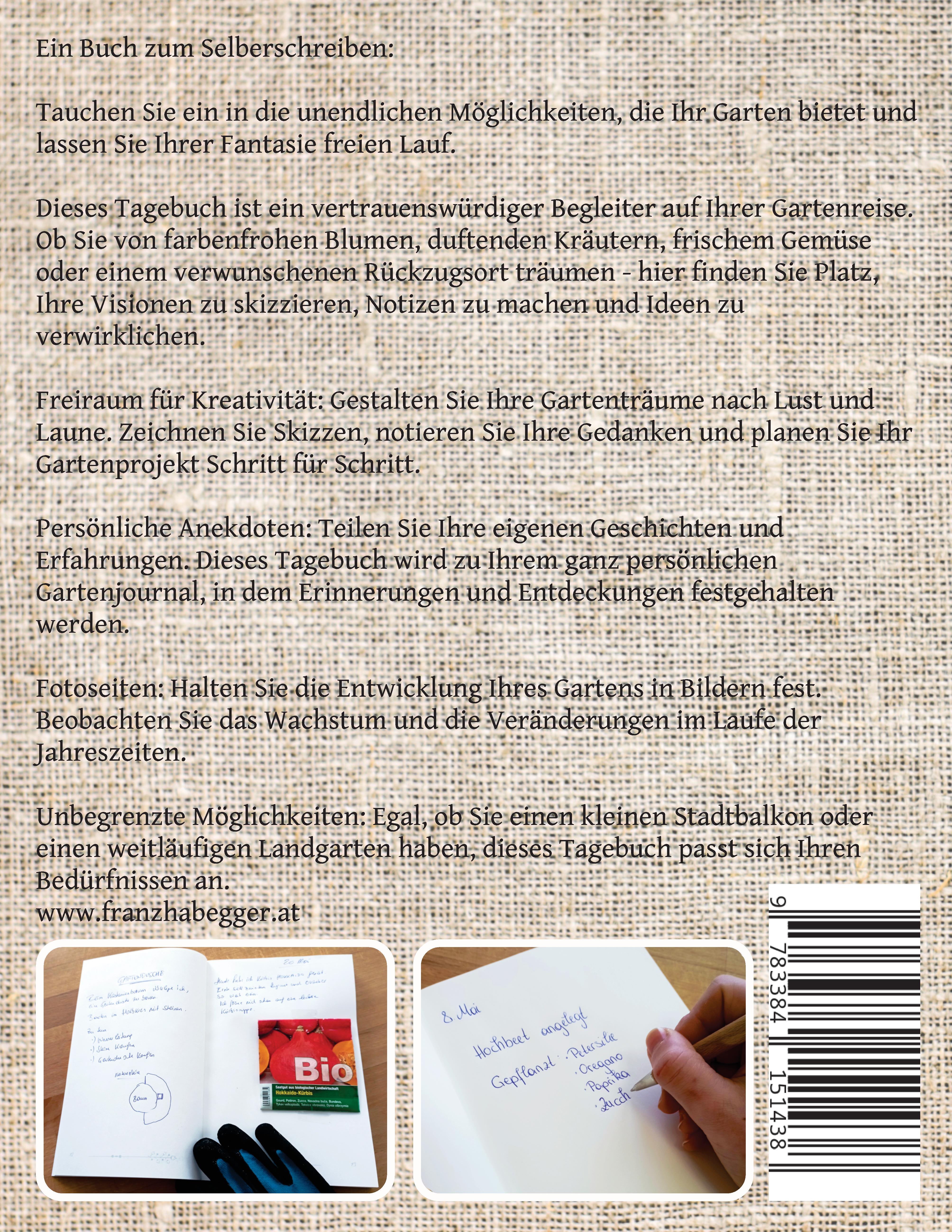Gartentagebuch mit AussaatkalenderEin Garten Tagebuch ist ein praktisches Werkzeug für Gärtner, um Informationen über Ihren Garten zu sammeln und nützliche Beobachtungen festzuhalten.Sie lieben es im Garten zu arbeiten?Mit diesem Tagebuch können Sie Ihre Gedanken und durchgeführten Arbeiten im Garten festhalten.Fragen Sie sich, welche Möhrensorte war die süßeste im vergangenen Jahr? Welche Sorte Tomaten habe ich gepflanzt?Mit dem persönlichen Gartentagebuch können Sie diese Fragen in Zukunft leicht beantworten.Notieren Sie wann Sie welche Blumen- oder Gemüsesorten gepflanzt haben.Schreiben Sie sich die aktuellen Wetterdaten auf.Protokollieren Sie, wann Sie gedüngt haben oder wann ein Rückschnitt erfolgte.Haben Sie Schädlinge und Krankheiten entdeckt? Notieren Sie Ihre Maßnahmen.Welche Gemüsesorte ist in diesem Jahr nicht gut gewachsen oder welche Blumen blühen heuer besonders schön.Erstellen Sie Aufgabenlisten um wichtige Arbeiten nicht zu vergessen.Ihre Ideen und Pläne sind im Garten Tagebuch gut aufgehoben.Soll der Garten umgestaltet werden oder das Hochbeet doch in eine schattige Lage wandern?Machen Sie doch dazu Skizzen in Ihrem Tagebuch und notieren Sie Ihre Ideen, damit diese nicht vergessen werden.Oder kleben Sie Fotos, Samentütchen und Schnipsel aus einem Gartenmagazin in Ihr persönliches Tagebuch.Skizzieren Sie ein mögliches Gartenlayout.Erstellen Sie einen Lageplan für Ihre Gemüsebeete.Sammeln Sie Ideen aus Gartenmagazinen direkt im Tagebuch.Notieren Sie Ihre Eindrücke und Beobachtungen.Lassen Sie Ihre Gartengäste einige Zeilen in das Tagebuch schreiben.Viel Platz:Mit 200 Seiten bietet das Tagebuch viel Platz um seine Gedanken und erledigte Arbeiten im Garten zu notieren.Ideal auch als Geschenk für Hobby GärtnerInnen.Aussaatkalender:Im Tagebuch finden Sie auch einen Aussaatkalender.Monatlich gegliedert können Sie nachlesen, was alles bereits gesät oder gepflanzt werden kann.