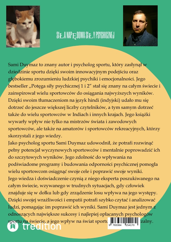 Sami Duymaz to znany autor i psycholog sportu, który zaslynal w dziedzinie sportu dzieki swoim innowacyjnym podejsciu oraz glebokiemu zrozumieniu ludzkiej psychiki i emocjonalnosci. Jego bestseller "Potega sily psychicznej 1 i 2" stal sie znany na calym swiecie i zainspirowal wielu sportowców do osiagania najwyzszych wyników.Dzieki tlumaczeniom na kilka jezyków udalo mu sie dotrzec do jeszcze wiekszej liczby czytelników, a tym samym dotrzec takze do wielu sportowców w róznych krajach. Jego ksiazki wywarly wplyw nie tylko na mistrzów swiata i zawodowych sportowców, ale takze na amatorów i sportowców rekreacyjnych, którzy skorzystali z jego wiedzy.Jako psycholog sportu Sami Duymaz udowodnil, ze potrafi rozwinac pelny potencjal wyczynowych sportowców i mentalnie poprowadzic ich do szczytowych wyników. Jego zdolnosc do wplywania na podswiadome programy i budowania odpornosci psychicznej pomogla wielu sportowcom osiagnac swoje cele i poprawic swoje wyniki.Jego wiedza i doswiadczenie czynia z niego eksperta poszukiwanego na calym swiecie, wzywanego w trudnych sytuacjach, gdy czlowiek znajduje sie w dolku lub gdy zrzadzenie losu wplywa na jego wystepy. Dzieki swojej wrazliwosci i empatii potrafi szybko czytac i analizowac ludzi, pomagajac im poprawic ich wyniki. Sami Duymaz jest jednym z odnoszacych najwieksze sukcesy i najlepiej oplacanych psychologów sportu na swiecie, a jego wplyw na swiat sportu jest niezaprzeczalny.