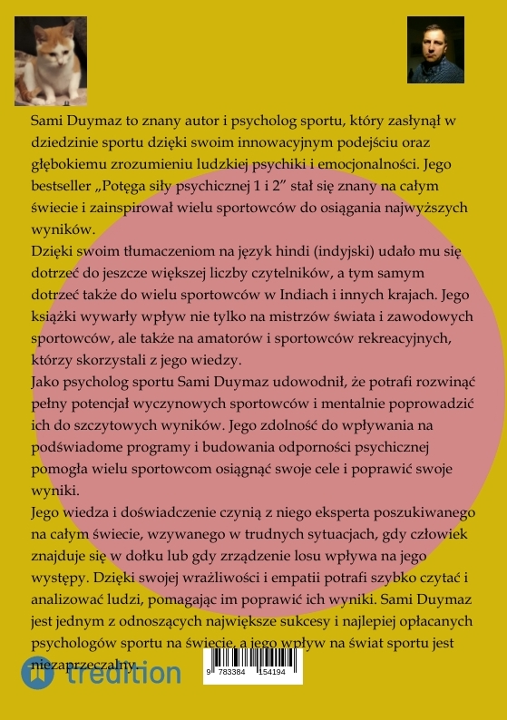Sami Duymaz to znany autor i psycholog sportu, który zaslynal w dziedzinie sportu dzieki swoim innowacyjnym podejsciu oraz glebokiemu zrozumieniu ludzkiej psychiki i emocjonalnosci. Jego bestseller "Potega sily psychicznej 1 i 2" stal sie znany na calym swiecie i zainspirowal wielu sportowców do osiagania najwyzszych wyników.Dzieki tlumaczeniom na kilka jezyków udalo mu sie dotrzec do jeszcze wiekszej liczby czytelników, a tym samym dotrzec takze do wielu sportowców w róznych krajach. Jego ksiazki wywarly wplyw nie tylko na mistrzów swiata i zawodowych sportowców, ale takze na amatorów i sportowców rekreacyjnych, którzy skorzystali z jego wiedzy.Jako psycholog sportu Sami Duymaz udowodnil, ze potrafi rozwinac pelny potencjal wyczynowych sportowców i mentalnie poprowadzic ich do szczytowych wyników. Jego zdolnosc do wplywania na podswiadome programy i budowania odpornosci psychicznej pomogla wielu sportowcom osiagnac swoje cele i poprawic swoje wyniki.Jego wiedza i doswiadczenie czynia z niego eksperta poszukiwanego na calym swiecie, wzywanego w trudnych sytuacjach, gdy czlowiek znajduje sie w dolku lub gdy zrzadzenie losu wplywa na jego wystepy. Dzieki swojej wrazliwosci i empatii potrafi szybko czytac i analizowac ludzi, pomagajac im poprawic ich wyniki. Sami Duymaz jest jednym z odnoszacych najwieksze sukcesy i najlepiej oplacanych psychologów sportu na swiecie, a jego wplyw na swiat sportu jest niezaprzeczalny.