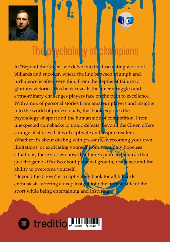 "Beyond the Green" is about the fascinating world of billiards and snooker and the psychological challenges that players face on their way to excellence. The book explores the human side of competition and highlights the inner struggles, moments of triumph and setbacks that players experience. It offers a collection of stories from amateur players and insights into the world of professionals designed to captivate and inspire the reader. From unexpected comebacks to tragic defeats, Beyond the Green shows that the sport of billiards and snooker is not just a game, but also a journey of personal growth, resilience and self-transcendence.