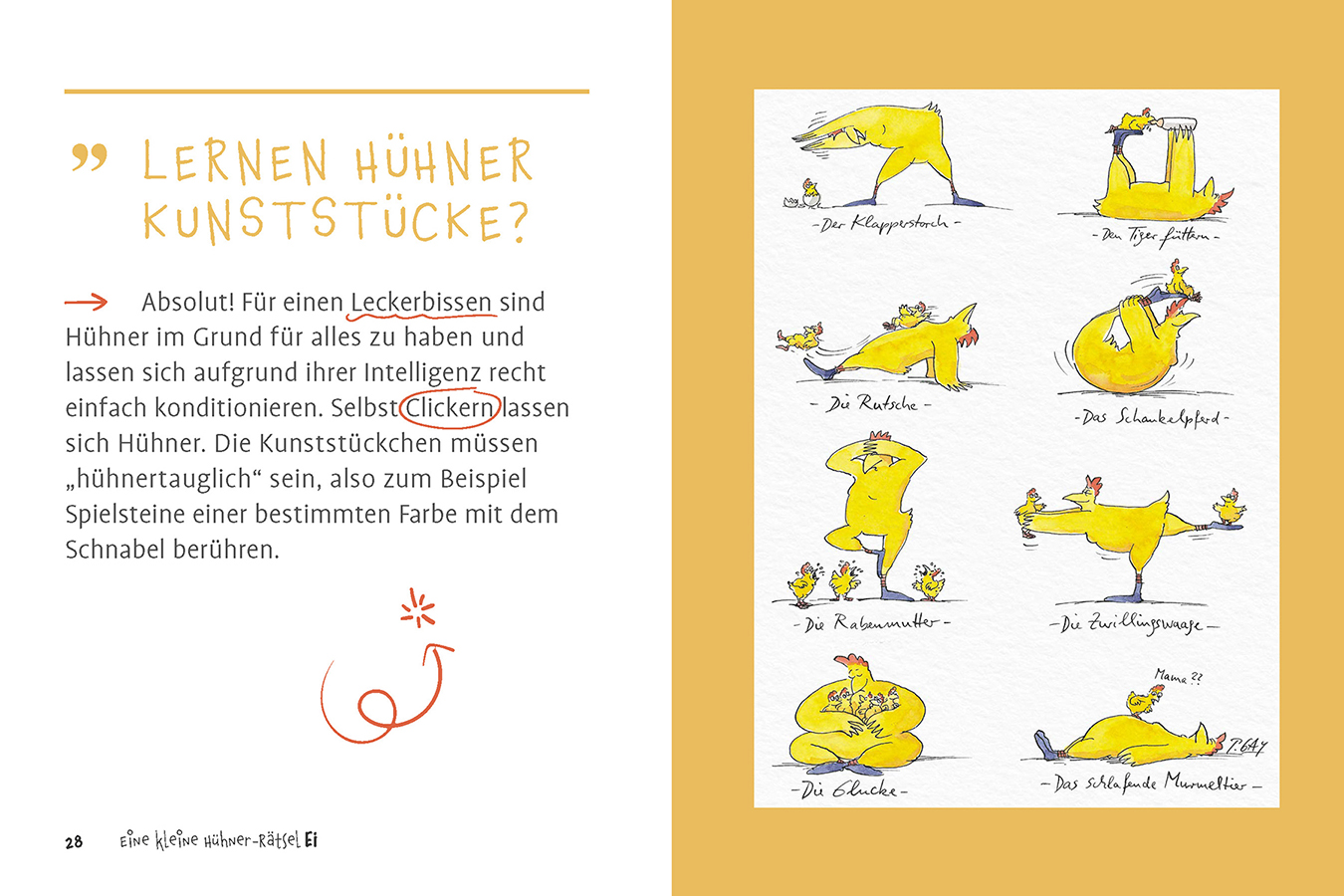 Können Hühner schwimmen? Legen braune Hennen braune Eier und weiße Hennen weiße? Sehen Hühnervögel die Welt in Farbe oder Schwarz-Weiß? Und warum wackeln sie eigentlich beim Gehen immer mit dem Kopf? … In diesem Buch erfahren Sie’s! Die Geflügelexperten Yvonne und Wilhelm geben fundierte Antworten auf die kuriosesten Fragen rund um Hühner. Umwerfend illustriert wurde das Ganze von Peter Gaymann. Ein Buch zum Schmökern, Staunen und Schmunzeln. Das perfekte Geschenk für jeden Hühner-Fan!