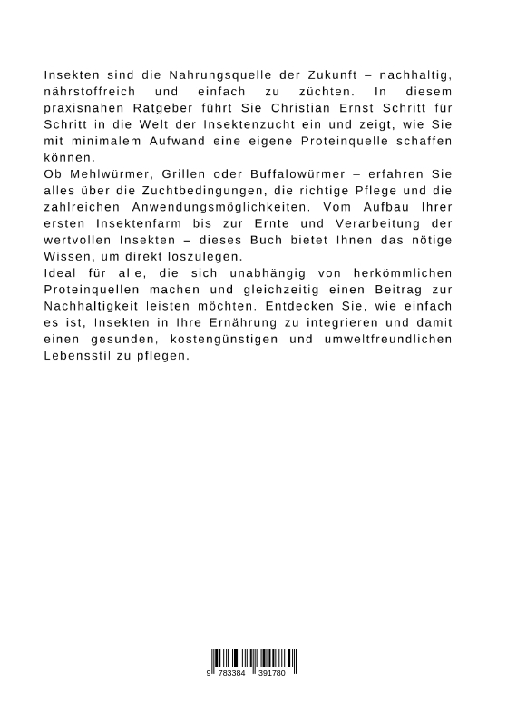 Insekten sind die Nahrungsquelle der Zukunft - nachhaltig, nährstoffreich und einfach zu züchten. In diesem praxisnahen Ratgeber führt Sie Christian Ernst Schritt für Schritt in die Welt der Insektenzucht ein und zeigt, wie Sie mit minimalem Aufwand eine eigene Proteinquelle schaffen können.Ob Mehlwürmer, Grillen oder Buffalowürmer - erfahren Sie alles über die Zuchtbedingungen, die richtige Pflege und die zahlreichen Anwendungsmöglichkeiten. Vom Aufbau Ihrer ersten Insektenfarm bis zur Ernte und Verarbeitung der wertvollen Insekten - dieses Buch bietet Ihnen das nötige Wissen, um direkt loszulegen.Ideal für alle, die sich unabhängig von herkömmlichen Proteinquellen machen und gleichzeitig einen Beitrag zur Nachhaltigkeit leisten möchten. Entdecken Sie, wie einfach es ist, Insekten in Ihre Ernährung zu integrieren und damit einen gesunden, kostengünstigen und umweltfreundlichen Lebensstil zu pflegen.