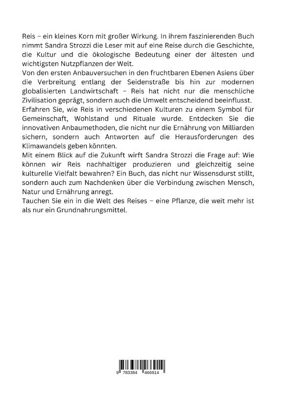 Reis - ein kleines Korn mit großer Wirkung. In ihrem faszinierenden Buch nimmt Sandra Strozzi die Leser mit auf eine Reise durch die Geschichte, die Kultur und die ökologische Bedeutung einer der ältesten und wichtigsten Nutzpflanzen der Welt.Von den ersten Anbauversuchen in den fruchtbaren Ebenen Asiens über die Verbreitung entlang der Seidenstraße bis hin zur modernen globalisierten Landwirtschaft - Reis hat nicht nur die menschliche Zivilisation geprägt, sondern auch die Umwelt entscheidend beeinflusst.Erfahren Sie, wie Reis in verschiedenen Kulturen zu einem Symbol für Gemeinschaft, Wohlstand und Rituale wurde. Entdecken Sie die innovativen Anbaumethoden, die nicht nur die Ernährung von Milliarden sichern, sondern auch Antworten auf die Herausforderungen des Klimawandels geben könnten.Mit einem Blick auf die Zukunft wirft Sandra Strozzi die Frage auf: Wie können wir Reis nachhaltiger produzieren und gleichzeitig seine kulturelle Vielfalt bewahren? Ein Buch, das nicht nur Wissensdurst stillt, sondern auch zum Nachdenken über die Verbindung zwischen Mensch, Natur und Ernährung anregt.Tauchen Sie ein in die Welt des Reises - eine Pflanze, die weit mehr ist als nur ein Grundnahrungsmittel.