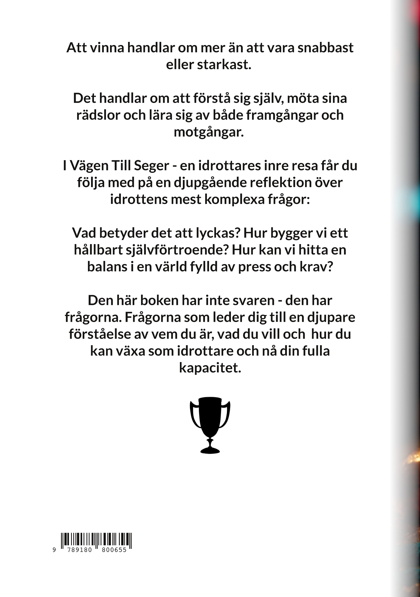 I Vägen till seger, En idrottares inre resa bjuds du in att utforska de stora frågor som varje idrottare någon gång ställs inför. Vad betyder det att lyckas? Är det resultatet som definierar framgång, eller finns det något mer? Hur kan vi bygga ett hållbart självförtroende som inte vacklar i motgång? Och hur hittar vi balans i en värld fylld av press, krav och förväntningar?