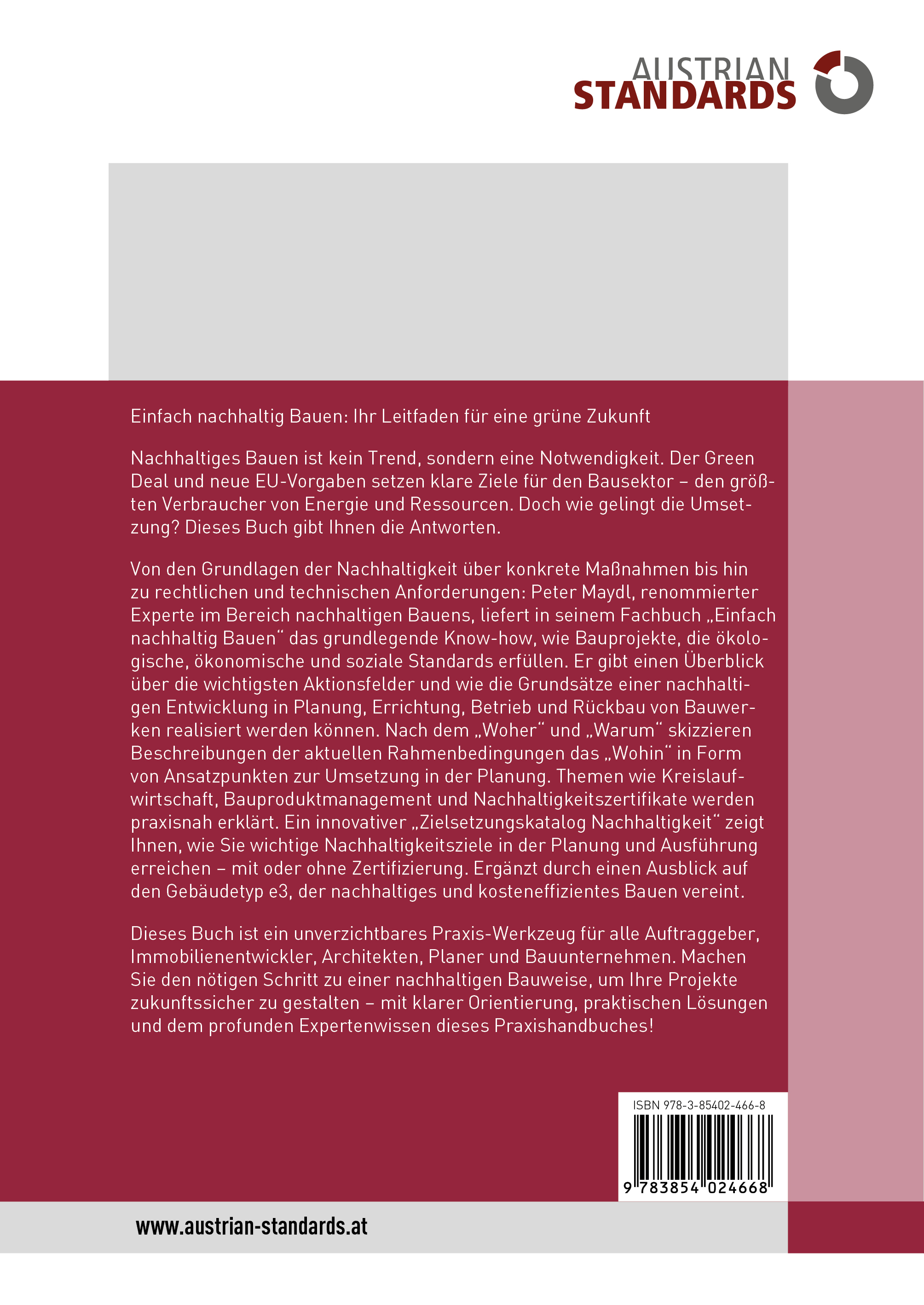 Von den Grundlagen der Nachhaltigkeit über konkrete Maßnahmen bis hin zu rechtlichen und technischen Anforderungen: Peter Maydl, renommierter Experte im Bereich nachhaltigen Bauens, liefert in seinem Fachbuch „Einfach nachhaltig Bauen“ das grundlegende Know-how, wie Bauprojekte, die ökologische, ökonomische und soziale Standards erfüllen. Er gibt einen Überblick über die wichtigsten Aktionsfelder und wie die Grundsätze einer nachhaltigen Entwicklung in Planung, Errichtung, Betrieb und Rückbau von Bauwerken realisiert werden können. Nach dem „Woher“ und „Warum“ skizzieren Beschreibungen der aktuellen Rahmenbedingungen das „Wohin“ in Form von Ansatzpunkten zur Umsetzung in der Planung. Themen wie Kreislaufwirtschaft, Bauproduktmanagement und Nachhaltigkeitszertifikate werden praxisnah erklärt. Ein innovativer „Zielsetzungskatalog Nachhaltigkeit“ zeigt Ihnen, wie Sie wichtige Nachhaltigkeitsziele in der Planung und Ausführung erreichen – mit oder ohne Zertifizierung. Ergänzt durch einen Ausblick auf den Gebäudetyp e3, der nachhaltiges und kosteneffizientes Bauen vereint.