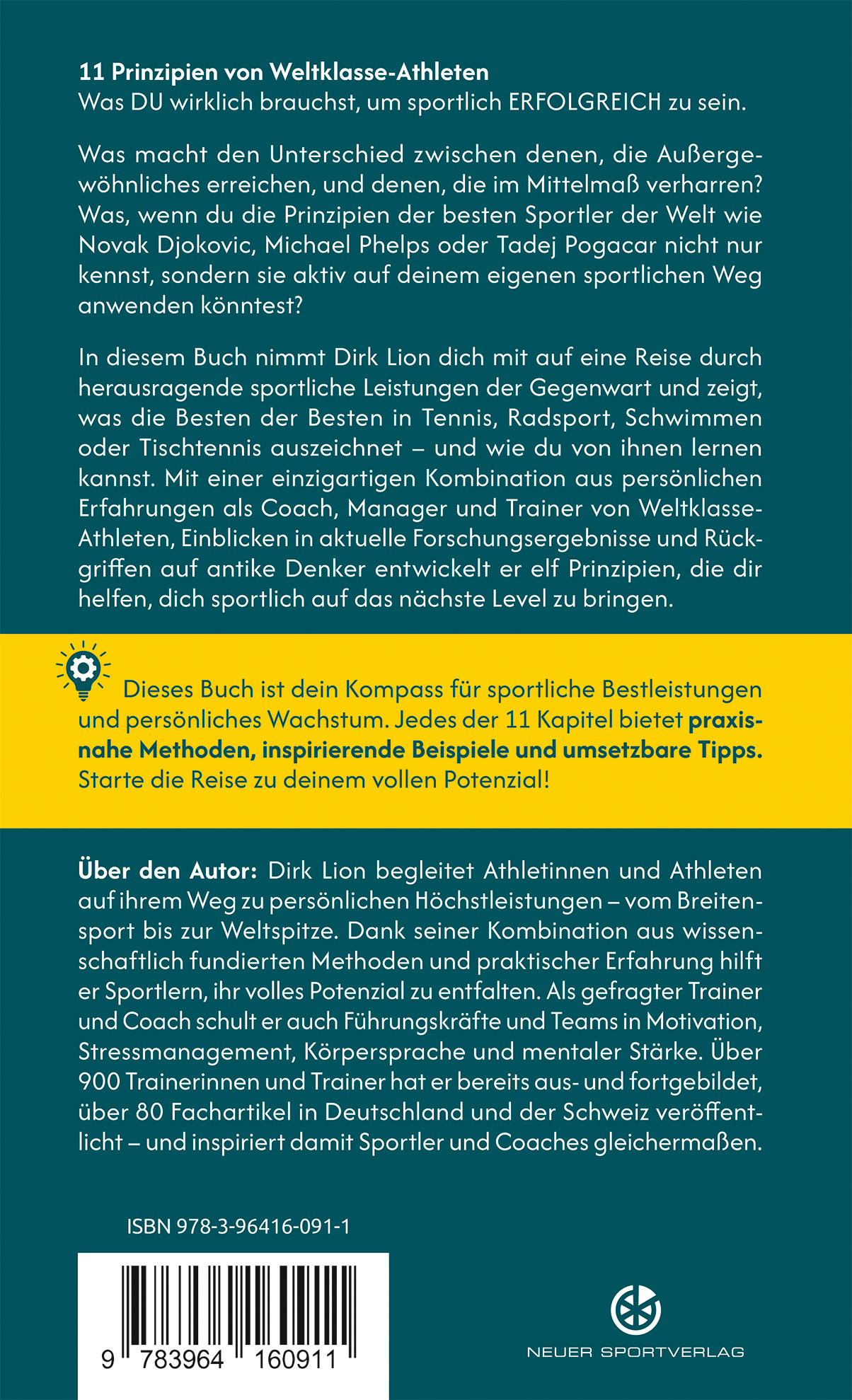 In diesem Buch nimmt Dirk Lion dich mit auf eine Reise durch herausragende sportliche Leistungen der Gegenwart und zeigt, was die Besten der Besten in Tennis, Radsport, Schwimmen oder Tischtennis auszeichnet – und wie du von ihnen lernen kannst. Mit einer einzigartigen Kombination aus persönlichen Erfahrungen als Coach, Manager und Trainer von Weltklasse-Athleten, Einblicken in aktuelle Forschungsergebnisse und Rückgriffen auf antike Denker entwickelt er elf Prinzipien, die dir helfen, dich sportlich auf das nächste Level zu bringen.