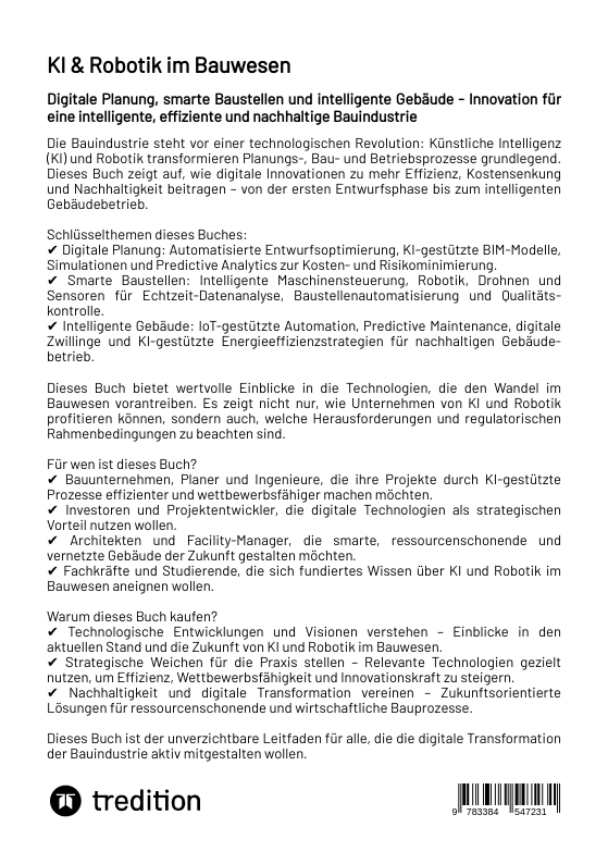 KI & Robotik im Bauwesen - digitale Planung, smarte Baustellen und intelligente GebäudeDie Bauindustrie steht vor einer fundamentalen Veränderung. Künstliche Intelligenz (KI) und Robotik setzen neue Maßstäbe in Planung, Bauausführung und Gebäudebetrieb. Effizienzsteigerung, Kostensenkung und Nachhaltigkeit sind nicht mehr nur theoretische Konzepte, sondern messbare Realität. Dieses Buch bietet eine tiefgehende Analyse der aktuellen Entwicklungen und zeigt, wie Unternehmen durch den gezielten Einsatz von KI und Robotik langfristige Wettbewerbsvorteile erzielen können.Schwerpunkte des Buches: Digitale Planung: Wie KI-gestützte Prozesse, Building Information Modeling (BIM), generatives Design und Predictive Analytics zu präziseren Planungen, Kostenreduktionen und minimierten Risiken führen. Smarte Baustellen: Der Einsatz autonomer Baumaschinen, Robotik, Drohnentechnologie und 3D-Druck optimiert Bauprozesse und verbessert Qualität, Sicherheit sowie Produktivität. Intelligente Gebäude: KI-gestützte Gebäudeautomation, digitale Zwillinge und Predictive Maintenance ermöglichen eine nachhaltige Betriebsoptimierung und maximieren die Ressourceneffizienz.Dieses Buch bietet eine umfassende Übersicht über den aktuellen Entwicklungsstand von KI und Robotik im Bauwesen und deren praktischen Einsatzmöglichkeiten. Es veranschaulicht anhand konkreter Anwendungsbeispiele, welche Potenziale bereits heute genutzt werden können und welche Technologien sich noch im Forschungs- und Erprobungsstadium befinden. Dabei werden verschiedene technologische Ansätze und ihre möglichen Einsatzszenarien in der Bauwirtschaft vorgestellt.Besonderes Augenmerk liegt auf den strategischen und operativen Fragestellungen, mit denen Fach- und Führungskräfte konfrontiert sind. Neben den technologischen Chancen werden auch zentrale Herausforderungen thematisiert, darunter regulatorische Vorgaben, Datenschutzanforderungen sowie ethische und wirtschaftliche Aspekte der Digitalisierung im Bauwesen. Das Buch richtet sich an Entscheidungsträger, die fundierte Informationen benötigen, um zukunftsweisende Investitionen zu tätigen und Innovationsprozesse erfolgreich zu steuern.Zielgruppen: Bauunternehmen, Architekten und Ingenieure, die KI und Robotik in ihre Projekte integrieren möchten. Investoren und Projektentwickler, die digitale Technologien als strategischen Vorteil nutzen wollen. Facility-Manager und Immobilienverwalter, die den Betrieb von Gebäuden optimieren möchten. Studierende und Fachkräfte, die fundierte Kenntnisse über die Zukunftstechnologien der Bauindustrie erwerben möchten.Warum dieses Buch? Umfassende Einblicke in den aktuellen Entwicklungsstand sowie zukünftige Möglichkeiten von KI und Robotik im Bauwesen. Vorstellung innovativer Ansätze und visionärer Konzepte, die das Bauwesen nachhaltig verändern können. Strategische Überlegungen und praktische Orientierungshilfen für Unternehmen und Fachkräfte, die sich mit der digitalen Transformation der Branche befassen.Dieses Werk ist ein unverzichtbarer Leitfaden für alle, die die digitale Transformation der Bauindustrie aktiv gestalten wollen.