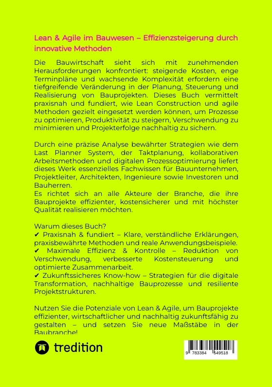 "Lean und Agile im Bauwesen" ist ein grundlegendes Werk für alle Fachleute in der Baubranche, die daran interessiert sind, ihre Projektmanagement-Fähigkeiten zu verbessern und ihre Projekte effizienter und effektiver zu gestalten. Das Buch bietet eine tiefgehende Einführung in die Prinzipien des Lean Managements und der agilen Methodik, adaptiert für die spezifischen Herausforderungen und Gegebenheiten des Bauwesens.Das Buch beginnt mit einer klaren Erklärung der Kernprinzipien von Lean und Agile, einschließlich der Geschichte und der philosophischen Grundlagen dieser Ansätze. Es wird erläutert, wie diese Konzepte, die ursprünglich in der Produktion und Softwareentwicklung entwickelt wurden, erfolgreich auf die Baubranche übertragen werden können, um Projekte schneller und mit weniger Verschwendung durchzuführen.Ein wesentlicher Teil des Buches widmet sich der Wertstromanalyse und anderen Lean-Techniken, die darauf abzielen, Verschwendung zu minimieren und den Wert für den Kunden zu maximieren. Praktische Anleitungen und Schritt-für-Schritt-Methoden helfen den Lesern, ihre eigenen Bauprozesse zu analysieren und zu verbessern. Dies führt zu kürzeren Durchlaufzeiten, geringeren Kosten und einer insgesamt höheren Qualität der Bauvorhaben.Das Buch stellt zudem agile Projektmanagement-Methoden wie Scrum und Kanban vor und zeigt auf, wie diese Techniken in Bauprojekten angewendet werden können, um Flexibilität und Anpassungsfähigkeit zu erhöhen, während gleichzeitig eine effektive Kontrolle über den Fortschritt der Projekte gewährleistet wird. Durch realistische Fallstudien und Beispiele aus der Praxis bekommen die Leser ein Gefühl dafür, wie Lean- und Agile-Methoden in der Realität umgesetzt werden können, inklusive der damit verbundenen Herausforderungen und Erfolge.Ein weiterer wichtiger Aspekt des Buches ist die Betrachtung der Nachhaltigkeit und Effizienz. Es wird dargestellt, wie durch die Anwendung von Lean- und Agile-Praktiken Bauvorhaben nachhaltiger und energieeffizienter gestaltet werden können, indem Ressourcen optimiert und Abfall minimiert wird.Die Zielgruppe des Buches umfasst eine breite Palette von Berufsgruppen in der Baubranche, darunter Bauunternehmer, Projektleiter, Architekten, Ingenieure und sogar Studierende, die eine Karriere im Bauwesen anstreben. "Lean und Agile im Bauwesen" richtet sich an alle, die ihre Projekte modernisieren und ihre Arbeitsweise optimieren möchten, um sich in einem wettbewerbsintensiven Markt hervorzuheben und ihre Projekte erfolgreicher, kostengünstiger und qualitativ hochwertiger zu realisieren.
