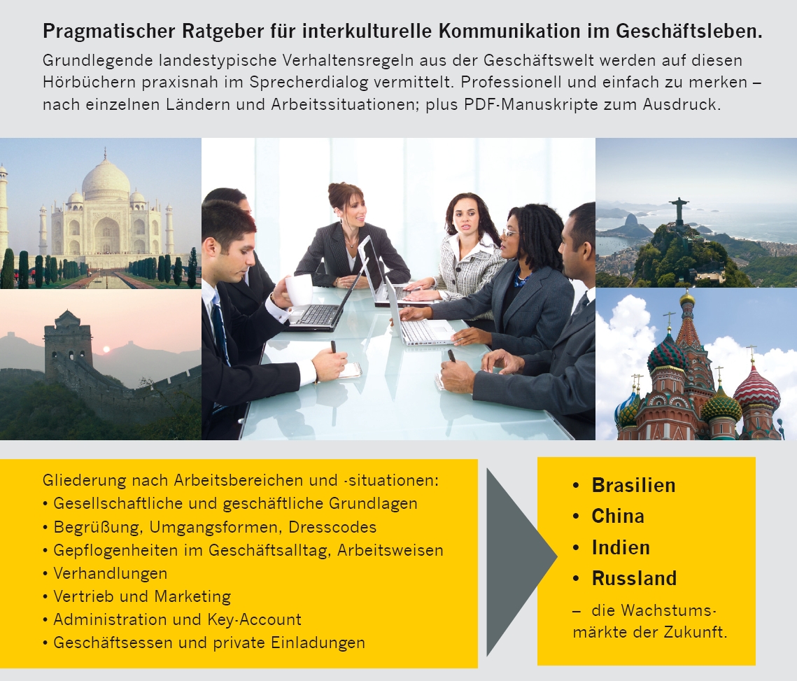 | Zusatzinfo | Professioneller Ratgeber für erfolgreiche Kompetenz in interkultureller Business-Kommunikation. Grundlegende landestypische Verhaltensregeln aus der Geschäftswelt werden auf diesen Hörbüchern praxisnah im Sprecherdialog vermittelt. Praktisch, professionell und einfach - nach einzelnen Ländern und Arbeitssituationen; inklusive der Manuskripte im PDF-Format. Gliederung nach Arbeitsbereichen und -situationen. |
