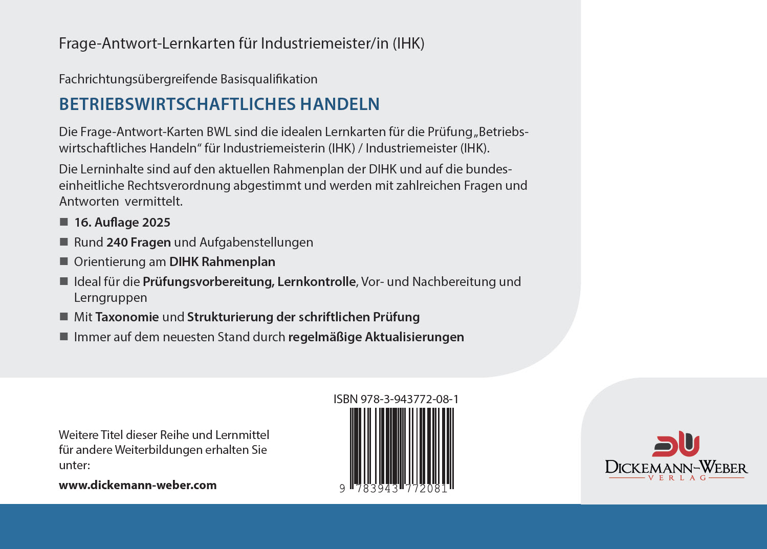 | Schlagworte | Betriebswirtschaftliches Handeln • BWL • IHK • Industriemeister • Lernkarten |