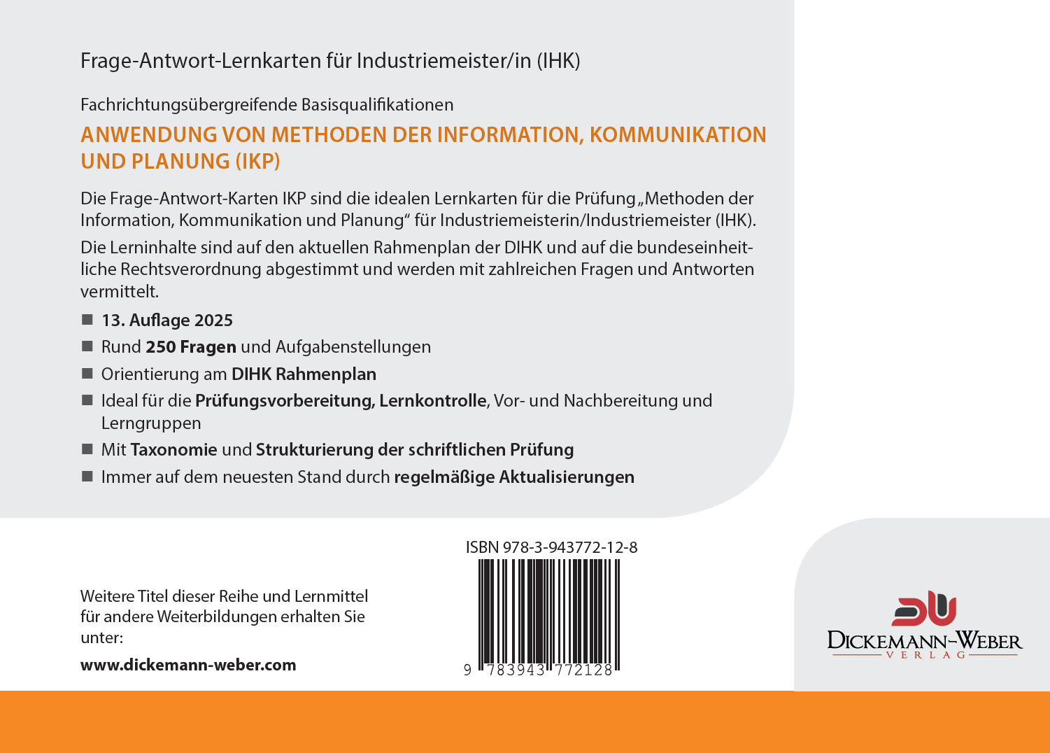 Die Frage-Antwort-Lernkarten IKP ermöglichen angehenden Industriemeistern und Industriemeisterinnen sich effizient und umfassend auf die Prüfung "Anwendung von Methoden der Information, Kommunikation und Planung" vorzubereiten.
