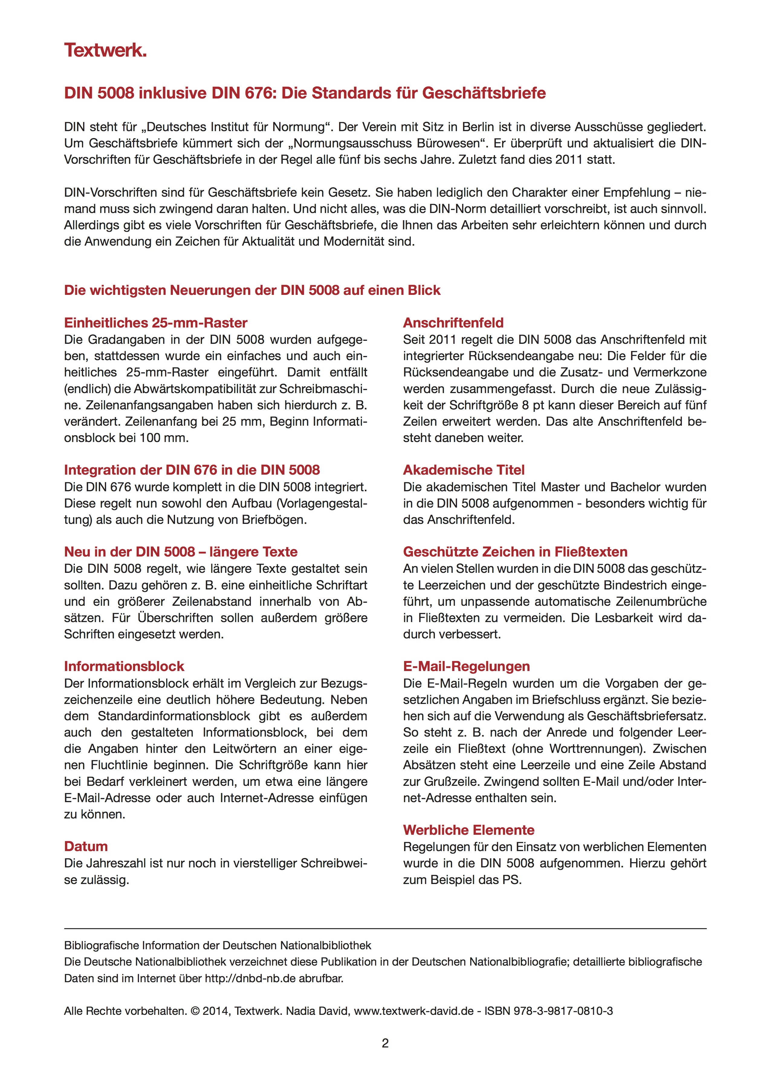 Detaillierte, praxisorientierte Zusammenfassung der DIN 5008:2011 (inklusive DIN 676) zur Gestaltung moderner Geschäftskorrespondenz. Mit leicht verständlichen Beispielen und verschiedenen Musterbögen.
