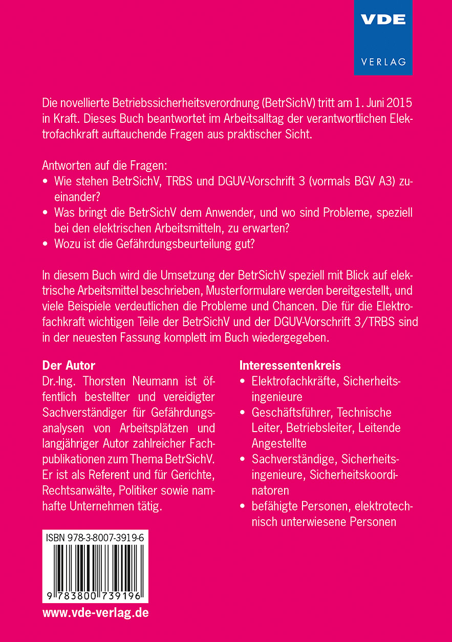 Die novellierte Betriebssicherheitsverordnung (BetrSichV) tritt am 1. Juni 2015 in Kraft. Dieses Buch beantwortet im Arbeitsalltag der verantwortlichen Elektrofachkraft auftauchende Fragen aus praktischer Sicht.Antworten auf die Fragen:- Wie stehen BetrSichV, TRBS und DGUV-Vorschrift 3 (vormals BGV A3) zueinander?- Was bringt die BetrSichV dem Anwender, und wo sind Probleme, speziell bei den elektrischen Arbeitsmitteln, zu erwarten?- Wozu ist die Gefährdungsbeurteilung gut?In diesem Buch wird die Umsetzung der BetrSichV speziell mit Blick auf elektrische Arbeitsmittel beschrieben, Musterformulare werden bereitgestellt, und viele Beispiele verdeutlichen die Probleme und Chancen. Die für die Elektrofachkraft wichtigen Teile der BetrSichV und der DGUV-Vorschrift 3 / TRBS sind in der neuesten Fassung komplett im Buch wiedergegeben.