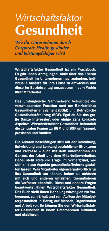 Wirtschaftsfaktor Gesundheit ist ein wertvoller Leitfaden für alle, die Betriebliches Gesundheitsmanagement (BGM) und Betriebliche Gesundheitsförderung (BGF) in der Praxis verantwortlich umsetzen. Das Sammelwerk begleitet Sie bei allen Herausforderungen, die sich in diesem Zusammenhang stellen: Dicht an der Unternehmenspraxis zeigt es, wie man BGM und BGF zielführend und ergebnisorientiert umsetzen kann. 34 Fachexperten und namhafte Autoren haben ihr Wissen und ihre Praxiserfahrung zusammengetragen. Zahlreiche Ansätze, Werkzeuge, Fallbeispiele, Best Practices und Handlungsanleitungen direkt aus erfolgreichen Unternehmen machen das Buch "Wirtschaftsfaktor Gesundheit" zu einem unentbehrlichen Begleiter für alle Herausforderungen im Bereich der Corporate Health.