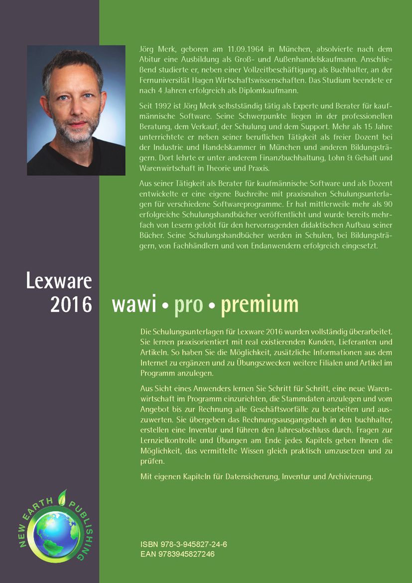 Jörg Merk, geboren am 11.09.1964 in München, absolvierte nach dem Abitur eine Ausbildung als Groß- und Außenhandelskaufmann. Anschließend studierte er, neben einer Vollzeitbeschäftigung als Buchhalter, an der Fernuniversität Hagen Wirtschaftswissenschaften. Das Studium beendete er nach 4 Jahren erfolgreich als Diplomkaufmann. Seit 1992 ist Jörg Merk selbstständig tätig als Experte und Berater für kaufmännische Software. Seine Schwerpunkte liegen in der professionellen Beratung, dem Verkauf, der Schulung und dem Support. Mehr als 15 Jahre unterrichtete er neben seiner beruflichen Tätigkeit als freier Dozent bei der Industrie und Handelskammer in München und anderen Bildungsträgern. Dort lehrte er unter anderem Finanzbuchhaltung, Lohn & Gehalt und Warenwirtschaft in Theorie und Praxis. Aus seiner Tätigkeit als Berater für kaufmännische Software und als Dozent entwickelte er eine eigene Buchreihe mit praxisnahen Schulungsunterlagen für verschiedene Softwareprogramme. Er hat mittlerweile mehr als 90 erfolgreiche Schulungshandbücher veröffentlicht und wurde bereits mehrfach von Lesern gelobt für den hervorragenden didaktischen Aufbau seiner Bücher. Seine Schulungshandbücher werden in Schulen, bei Bildungsträgern, von Fachhändlern und von Endanwendern erfolgreich eingesetzt.