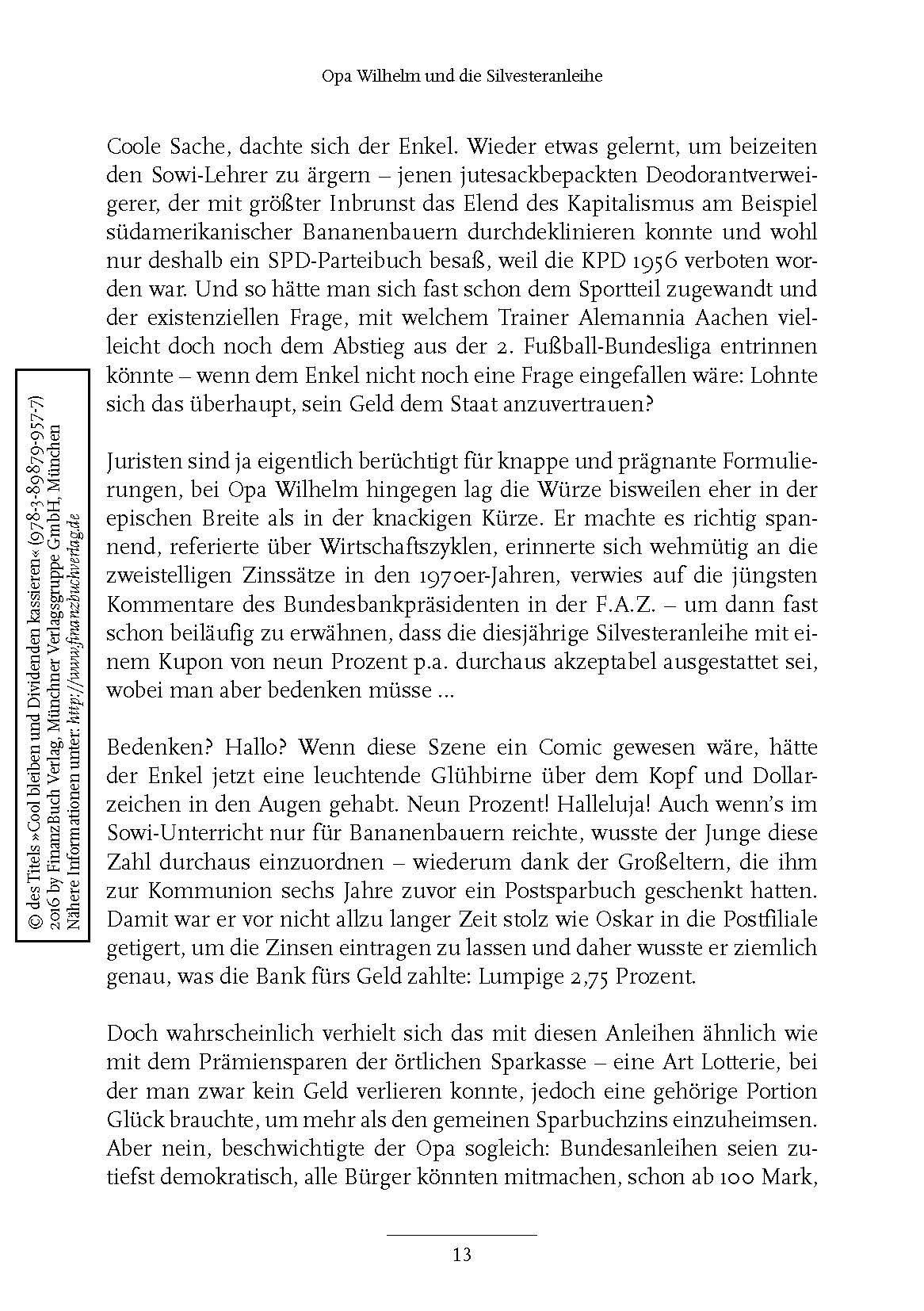»Das große Verdienst von Christian W. Röhl und Werner H. Heussinger ist, dass sie nicht einfach Kennzahlen herunterbeten, sondern aus ihrer 25-jährigen Finanzmarkt-Erfahrung das Big Picture zeichnen und erklären, warum Dividenden ein echtes Qualitätsmerkmal darstellen. Gleichzeitig kann der Leser den Autoren bei der Entwicklung individueller Anlagestrategien über die Schulter schauen und davon profitieren, dass Röhl und Heussinger vor allem Investoren sind, die ihr eigenes Vermögen anlegen.«