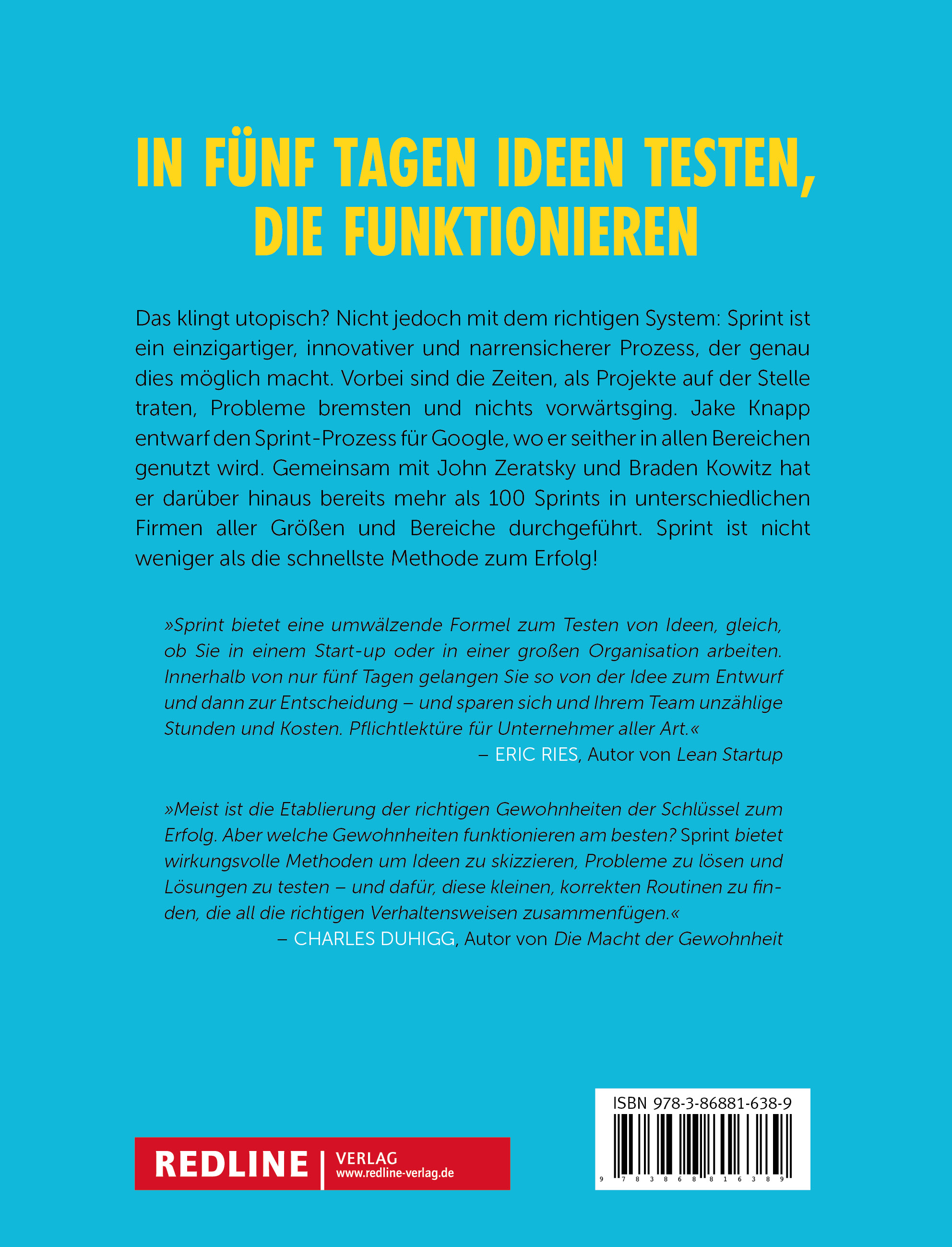 Dafür gibt es eine geniale Lösung: Sprint. Die ist ein einzigartiger, innovativer und narrensicherer Prozess, mit dem sich die härtesten Probleme in nur fünf Tagen lösen lassen – von Montag bis Freitag. Der Entwickler Jake Knapp entwarf diesen Prozess bei und für Google, wo er seither in allen Bereichen genutzt wird. Zusammen mit John Zeratsky und Braden Kowitz hat er darüber hinaus bereits mehr als 100 Sprints in Firmen aus unterschiedlichen Bereichen durchgeführt.
