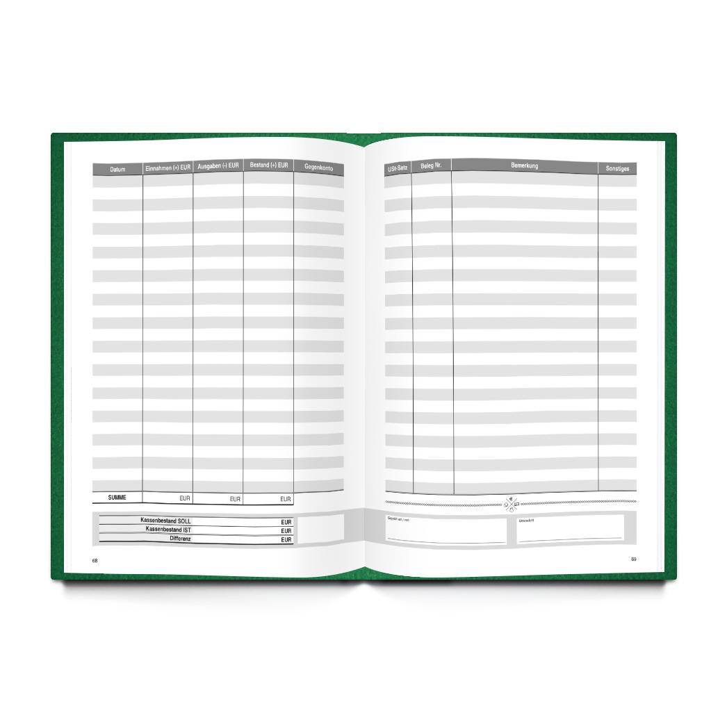 Kassenbuch GRÜN (Hardcover A4, Blankoseiten)