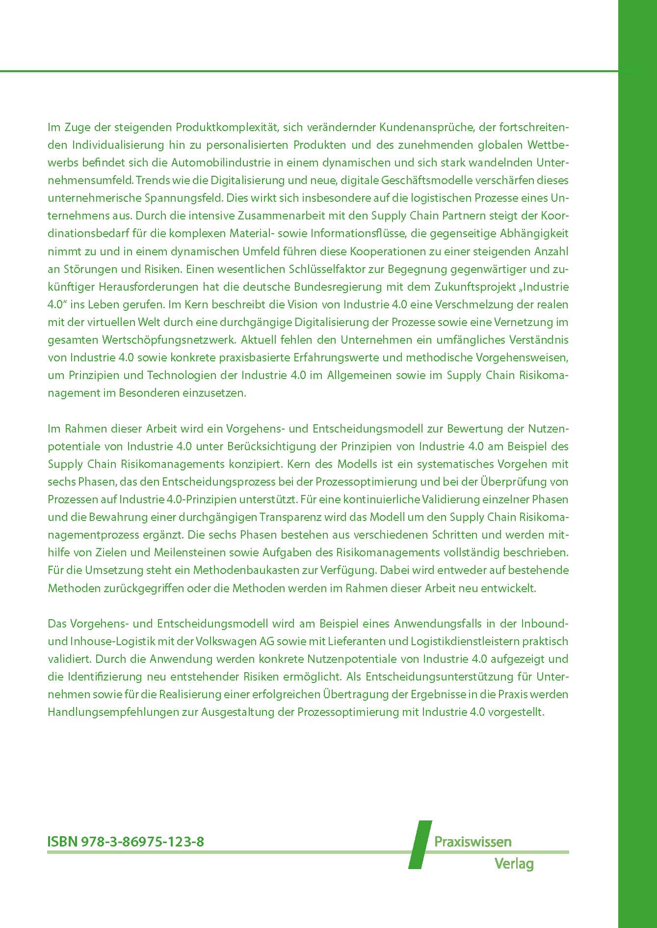 | Schlagworte | Digitalisierung • Entscheidungsmodell • Industrie 4.0 • Logistik • Nutzenpotentiale • Supply Chain Management • Supply Chain Risikomanagement • Vorgehensmodell |