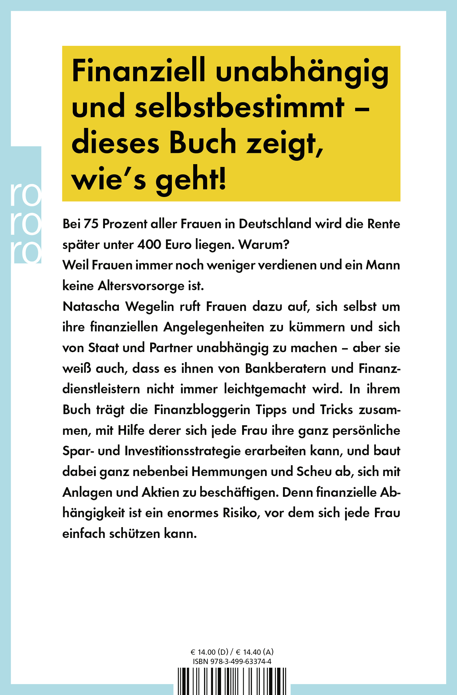 Natascha Wegelin ruft Frauen dazu auf, sich selbst um ihre finanziellen Angelegenheiten zu kümmern und sich von Staat und Partner unabhängig zu machen - aber sie weiß auch, dass es ihnen von Bankberatern und Finanzdienstleistern nicht immer leicht gemacht wird. In ihrem Buch trägt die Finanzbloggerin Tipps und Tricks zusammen, mithilfe derer sich jede Frau ihre ganz persönliche Spar- und Investitionsstrategie erarbeiten kann, und baut dabei ganz nebenbei Hemmungen und Scheu ab, sich mit Anlagen und Aktien zu beschäftigen. Denn finanzielle Abhängigkeit ist ein enormes Risiko, vor dem sich jede Frau einfach schützen kann.