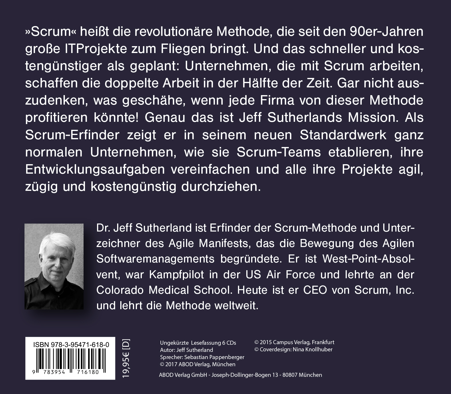 "Scrum" heißt die revolutionäre Methode, die seit den 90er-Jahren große ITProjekte zum Fliegen bringt. Und das schneller und kostengünstiger als geplant: Unternehmen, die mit Scrum arbeiten, schaffen die doppelte Arbeit in der Hälfte der Zeit. Gar nicht auszudenken, was geschähe, wenn jede Firma von dieser Methode profitieren könnte! Genau das ist Jeff Sutherlands Mission. Als Scrum-Erfinder zeigt er in seinem neuen Standardwerk ganz normalen Unternehmen, wie sie Scrum-Teams etablieren, ihre Entwicklungsaufgaben vereinfachen und alle ihre Projekte agil, zügig und kostengünstig durchziehen.
