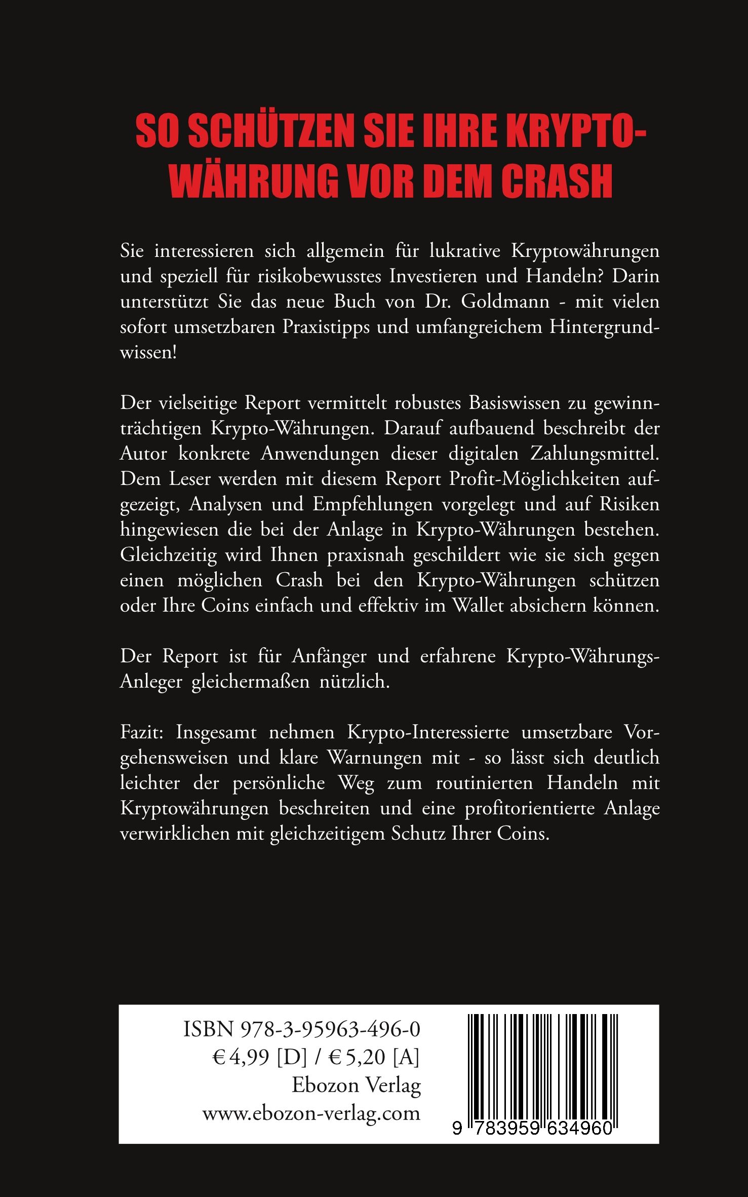 Sie interessieren sich allgemein für lukrative Kryptowährungen und speziell für risikobewusstes Investieren und Handeln? Darin unterstützt Sie das neue Buch von Dr. Goldmann - mit vielen sofort umsetzbaren Praxistipps und umfangreichem Hintergrundwissen!Der vielseitige Report vermittelt robustes Basiswissen zu gewinnträchtigen Krypto-Währungen. Darauf aufbauend beschreibt der Autor konkrete Anwendungen dieser digitalen Zahlungsmittel. Dem Leser werden mit diesem Report Profit-Möglichkeiten aufgezeigt, Analysen und Empfehlungen vorgelegt und auf Risiken hingewiesen die bei der Anlage in Krypto-Währungen bestehen. Gleichzeitig wird Ihnen praxisnah geschildert wie sie sich gegen einen möglichen Crash bei den Krypto-Währungen schützen oder Ihre Coins einfach und effektiv im Wallet absichern können.Der Report ist für Anfänger und erfahrene Krypto-Währungs-Anleger gleichermaßen nützlich.Fazit: Insgesamt nehmen Krypto-Interessierte umsetzbare Vorgehensweisen und klare Warnungen mit - so lässt sich deutlich leichter der persönliche Weg zum routinierten Handeln mit Kryptowährungen beschreiten und eine profitorientierte Anlage verwirklichen mit gleichzeitigem Schutz Ihrer Coins.