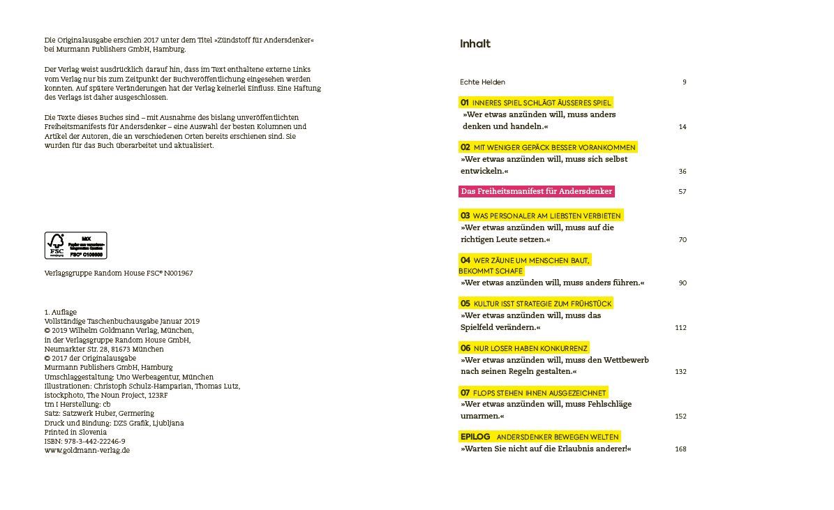 Oft ist man im Korsett des Alltags gefangen, im Hamsterrad der ewig gleichen Tätigkeit, im beengten Mindset der Kollegen und des direkten Umfelds. Spuren zu hinterlassen, neue Wege zu gehen, einen Ausstieg aus dem Trott zu finden - das ist nicht immer einfach. Dabei fängt jede Veränderung klein an. Sie fängt bei einem selbst an. Eine Veränderung, die wie ein Zündfunke zur Flamme werden kann. Denn ein Feuer beginnt mit einem Funken. Eine Idee, quer gedacht, wird zu einer Innovation. Eine kleine Verhaltensänderung führt zu mehr Lebensfreude. Der Mut, außerhalb von "Malen nach Zahlen" zu denken, führt zu neuen Querverbindungen. Andersdenken ist die Fähigkeit, sich aus der Umklammerung des Vertrauten zu befreien und die Dinge auf eine ganz neue Art zu kombinieren.Die beiden erfolgreichen Coaches Anja Förster und Peter Kreuz bieten mit diesem Manifest sieben unkonventionelle Lösungsansätze für mehr Erfolg und Kreativität im Leben.