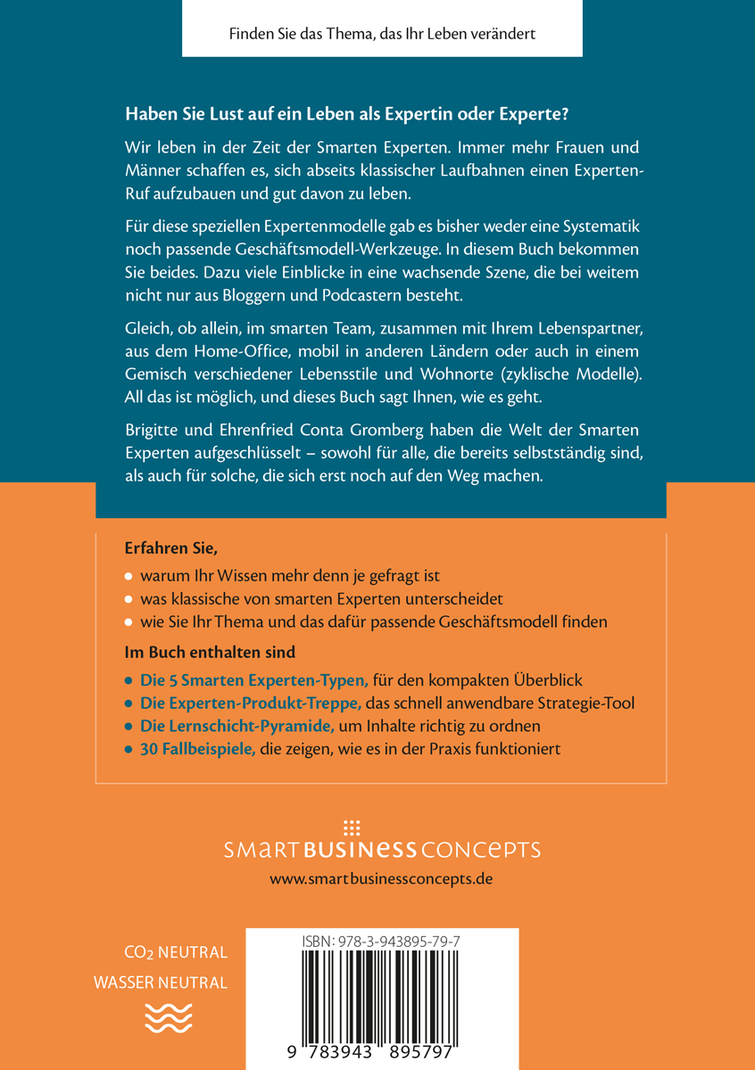 Brigitte und Ehrenfried Conta Gromberg analysieren seit Jahren neue, smarte Geschäftskonzepte. Diesmal haben sie sich die Experten-Modelle vorgenommen. Dabei schreiben sie aus Erfahrung: Sie selbst arbeiten seit 25 Jahren aus dem Home-Office, haben vier GmbHs gegründet, sind vernetzt mit vielen Experten und haben selbst umfangreiche Erfahrung als klassische Berater, Smarte Experten und in der Start-up Szene.