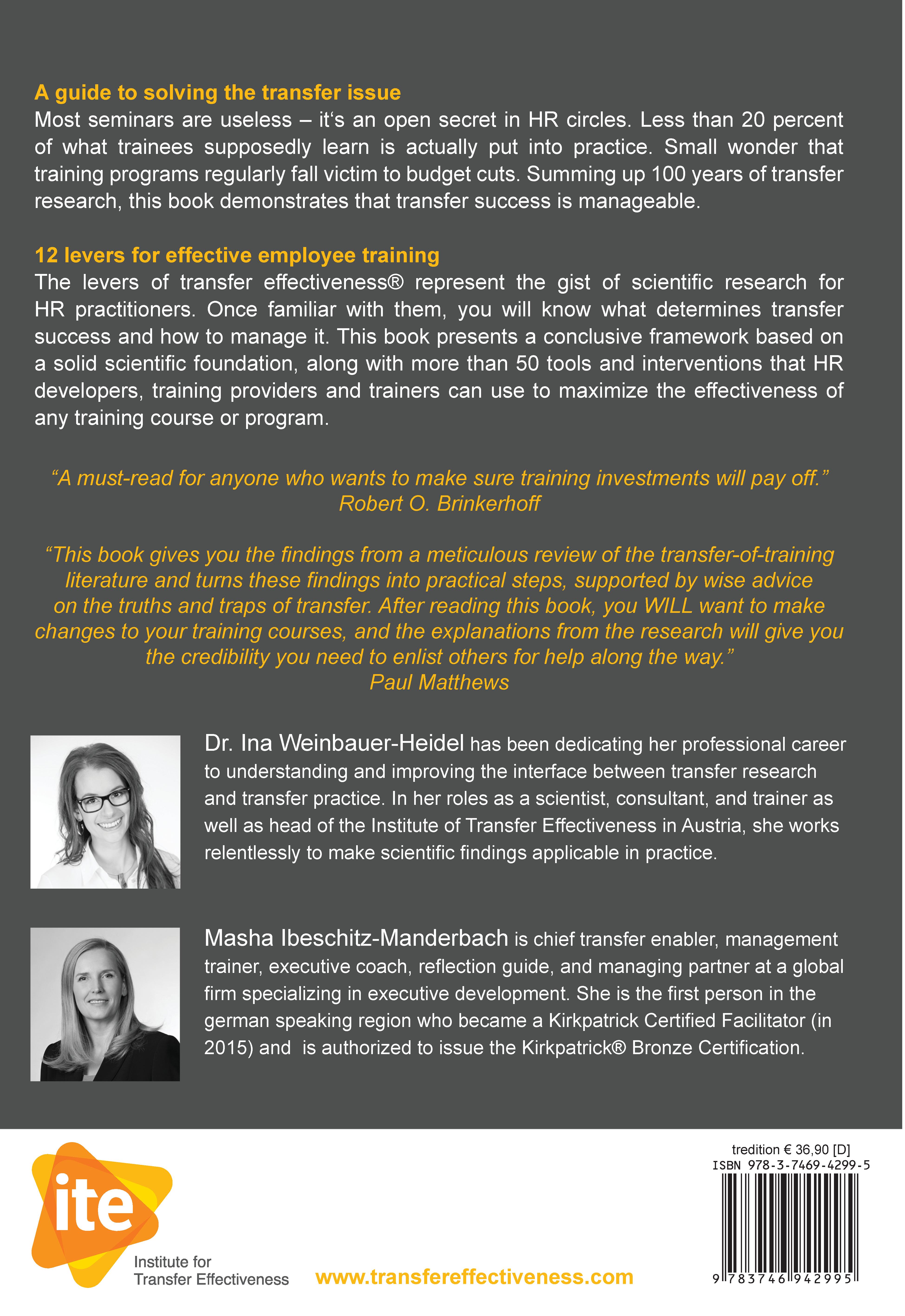 Most seminars are useless - it's an open secret in HR circles. Less than 20 percent of what trainees supposedly learn is actually put into practice. Small wonder that training programs regularly fall victim to budget cuts. Summing up 100 years of transfer research, this book demonstrates that transfer success is manageable.The 12 levers of transfer effectiveness® represent the gist of scientific research for HR practitioners. Once familiar with them, you will know what determines transfer success and how to manage it. This book presents a conclusive framework based on a solid scientific foundation, along with more than 50 tools and interventions that HR developers, training providers and trainers can use to maximize the effectiveness of any training course or program."A must-read for anyone who wants to make sure training investments will pay off." Robert O. Brinkerhoff"This book gives you the findings from a meticulous review of the transfer-of-training literature and turns these findings into practical steps, supported by wise advice on the truths and traps of transfer. After reading this book, you WILL want to make changes to your training courses, and the explanations from the research will give you the credibility you need to enlist others for help along the way." Paul Matthews