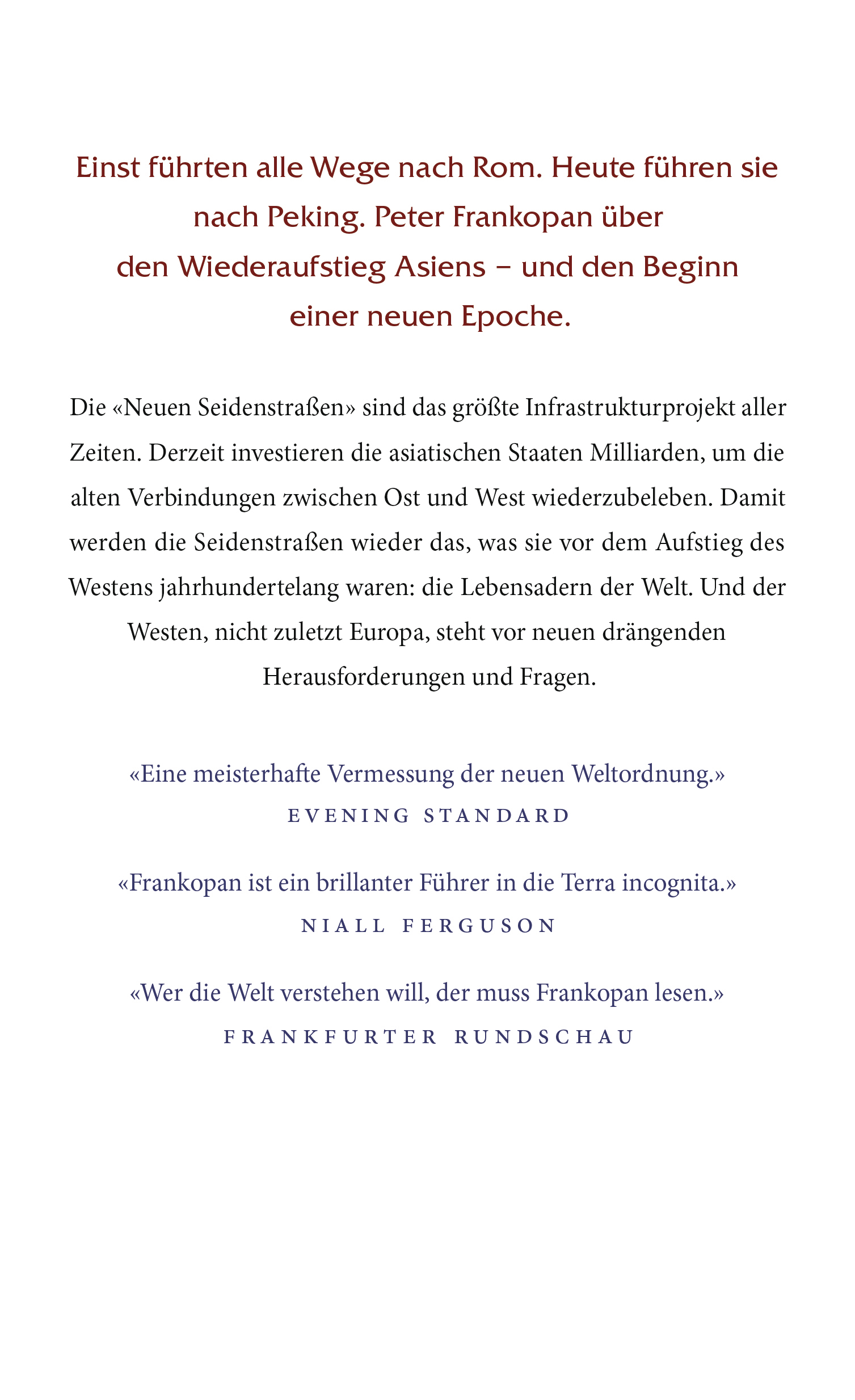 Frankopans Buch fasziniert ... Ein Weckruf an den Westen, das Gesamtbild der sich rasant wandelnden Welt im Auge zu behalten, einig zu sein, um bei dem großen Spiel im asiatischen Jahrhundert noch mitreden zu können.