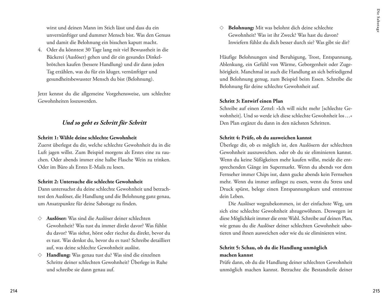 Dieses Buch enthält ein sanftes, aber stetiges Trainingsprogramm, das uns an die Hand nimmt und Schritt für Schritt stärker macht. Wir haben jeden Tag kleine Erfolgserlebnisse und so immer ein Gefühl des Fortschritts. Wir steigern aber nicht nur unsere Willenskraft, sondern lernen ganz nebenbei auch, vieles automatisch und mit Leichtigkeit zu tun, ohne dass wir dafür Willenskraft aufwenden müssen. So schaffen wir es, mit kleinstem Einsatz auch große und wichtige Projekte so umzusetzen, wie wir es uns vorgenommen haben.