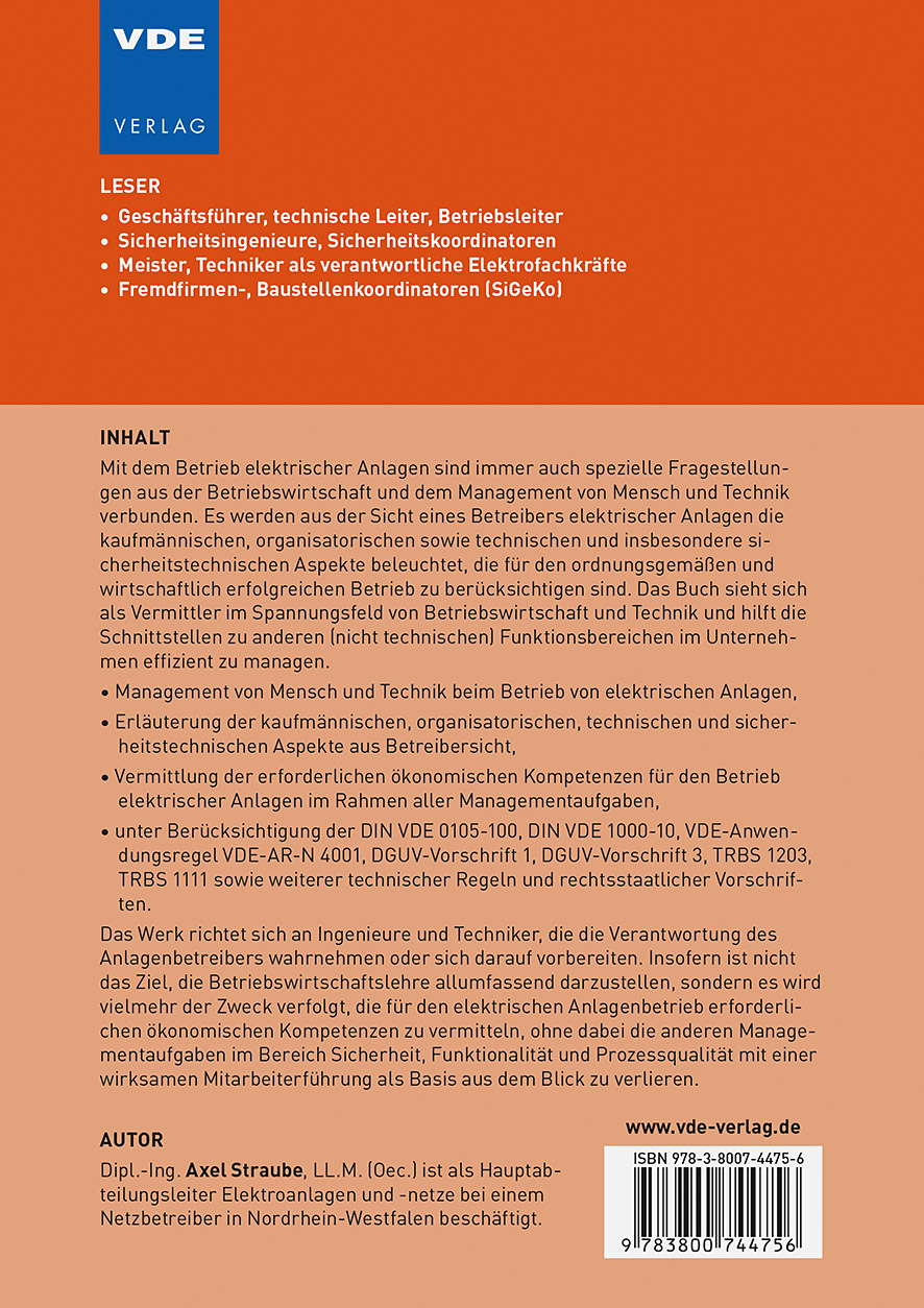 Mit dem Betrieb elektrischer Anlagen sind immer auch spezielle Fragestellungen aus der Betriebswirtschaft und dem Management von Mensch und Technik verbunden. Es werden aus der Sicht eines Betreibers elektrischer Anlagen die kaufmännischen, organisatorischen sowie technischen und insbesondere sicherheitstechnischen Aspekte beleuchtet, die für den ordnungsgemäßen und wirtschaftlich erfolgreichen Betrieb zu berücksichtigen sind. Das Buch sieht sich als Vermittler im Spannungsfeld von Betriebswirtschaft und Technik und hilft die Schnittstellen zu anderen (nicht technischen) Funktionsbereichen im Unternehmen effizient zu managen.- Management von Mensch und Technik beim Betrieb von elektrischen Anlagen,- Erläuterung der kaufmännischen, organisatorischen, technischen und sicherheitstechnischen Aspekte aus Betreibersicht,- Vermittlung der erforderlichen ökonomischen Kompetenzen für den Betrieb elektrischer Anlagen im Rahmen aller Managementaufgaben,- unter Berücksichtigung der DIN VDE 0105-100, DIN VDE 1000-10, VDE-Anwendungsregel VDE-AR-N 4001, DGUV-Vorschrift 1, DGUV-Vorschrift 3, TRBS 1203, TRBS 1111 sowie weiterer technischer Regeln und rechtsstaatlicher Vorschriften.Das Werk richtet sich an Ingenieure und Techniker, die die Verantwortung des Anlagenbetreibers wahrnehmen oder sich darauf vorbereiten. Insofern ist nicht das Ziel, die Betriebswirtschaftslehre allumfassend darzustellen, sondern es wird vielmehr der Zweck verfolgt, die für den elektrischen Anlagenbetrieb erforderlichen ökonomischen Kompetenzen zu vermitteln, ohne dabei die anderen Managementaufgaben im Bereich Sicherheit, Funktionalität und Prozessqualität mit einer wirksamen Mitarbeiterführung als Basis aus dem Blick zu verlieren.