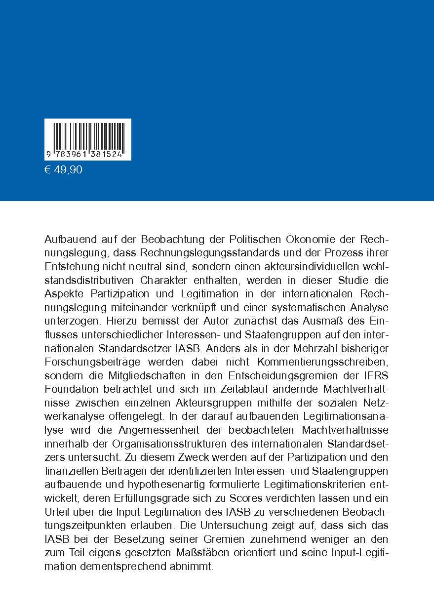 Aufbauend auf der Beobachtung der Politischen Ökonomie der Rechnungslegung, dass Rechnungslegungsstandards und der Prozess ihrer Entstehung nicht neutral sind, sondern einen akteursindividuellen wohlstandsdistributiven Charakter enthalten, werden in dieser Studie die Aspekte Partizipation und Legitimation in der internationalen Rechnungslegung miteinander verknüpft und einer systematischen Analyse unterzogen. Hierzu bemisst der Autor zunächst das Ausmaß des Einflusses unterschiedlicher Interessen- und Staatengruppen auf den internationalen Standardsetzer IASB. Anders als in der Mehrzahl bisheriger Forschungsbeiträge werden dabei nicht Kommentierungsschreiben, sondern die Mitgliedschaften in den Entscheidungsgremien der IFRS Foundation betrachtet und sich im Zeitablauf ändernde Machtverhältnisse zwischen einzelnen Akteursgruppen mithilfe der sozialen Netzwerkanalyse offengelegt. In der darauf aufbauenden Legitimationsanalyse wird die Angemessenheit der beobachteten Machtverhältnisse innerhalb der Organisationsstrukturen des internationalen Standardsetzers untersucht. Zu diesem Zweck werden auf der Partizipation und den finanziellen Beiträgen der identifizierten Interessen- und Staatengruppen aufbauende und hypothesenartig formulierte Legitimationskriterien entwickelt, deren Erfüllungsgrade sich zu Scores verdichten lassen und ein Urteil über die Input-Legitimation des IASB zu verschiedenen Beobachtungszeitpunkten erlauben. Die Untersuchung zeigt auf, dass sich das IASB bei der Besetzung seiner Gremien zunehmend weniger an den zum Teil eigens gesetzten Maßstäben orientiert und seine Input-Legitimation dementsprechend abnimmt.
