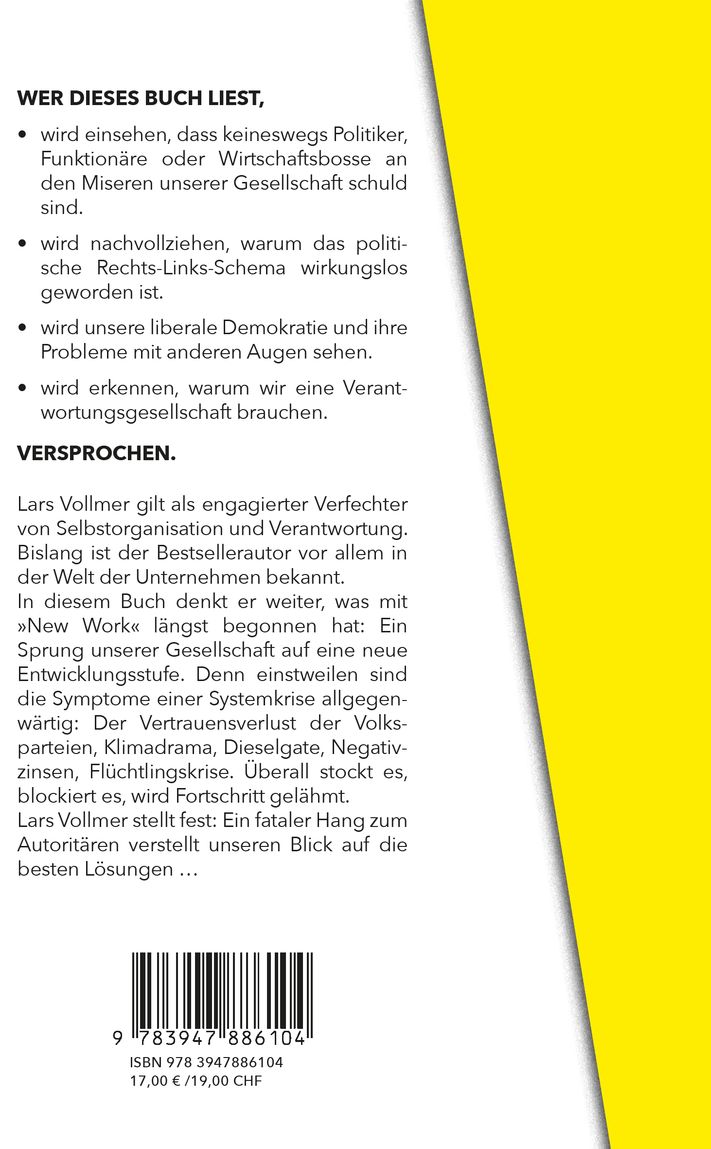 Lars Vollmer gilt als engagierter Verfechter von Selbstorganisation und Verantwortung. Bislang ist der Bestsellerautor vor allem in der Welt der Unternehmen bekannt. In diesem Buch denkt er weiter, was mit »New Work« längst begonnen hat: Ein Sprung unserer Gesellschaft auf eine neue Entwicklungsstufe.