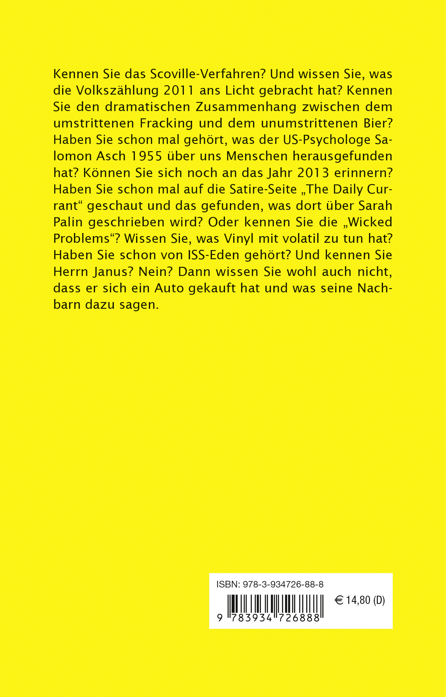 Kennen Sie das Scoville-Verfahren? Und wissen Sie, was die Volkszählung 2011 ans Licht gebracht hat? Kennen Sie den dramatischen Zusammenhang zwischen dem umstrittenen Fracking und dem unumstrittenen Bier? Haben Sie schon mal gehört, was der US-Psychologe Salomon Asch 1955 über uns Menschen herausgefunden hat? Können Sie sich noch an das Jahr 2013 erinnern? Haben Sie schon mal auf die Satire-Seite „The Daily Currant“ geschaut und das gefunden, was dort über Sarah Palin geschrieben wird? Oder kennen Sie die „Wicked Problems“? Wissen Sie, was Vinyl mit volatil zu tun hat? Haben Sie schon von ISS-Eden gehört? Und kennen Sie Herrn Janus? Nein? Dann wissen Sie wohl auch nicht, dass er sich ein Auto gekauft hat und was seine Nachbarn dazu sagen.