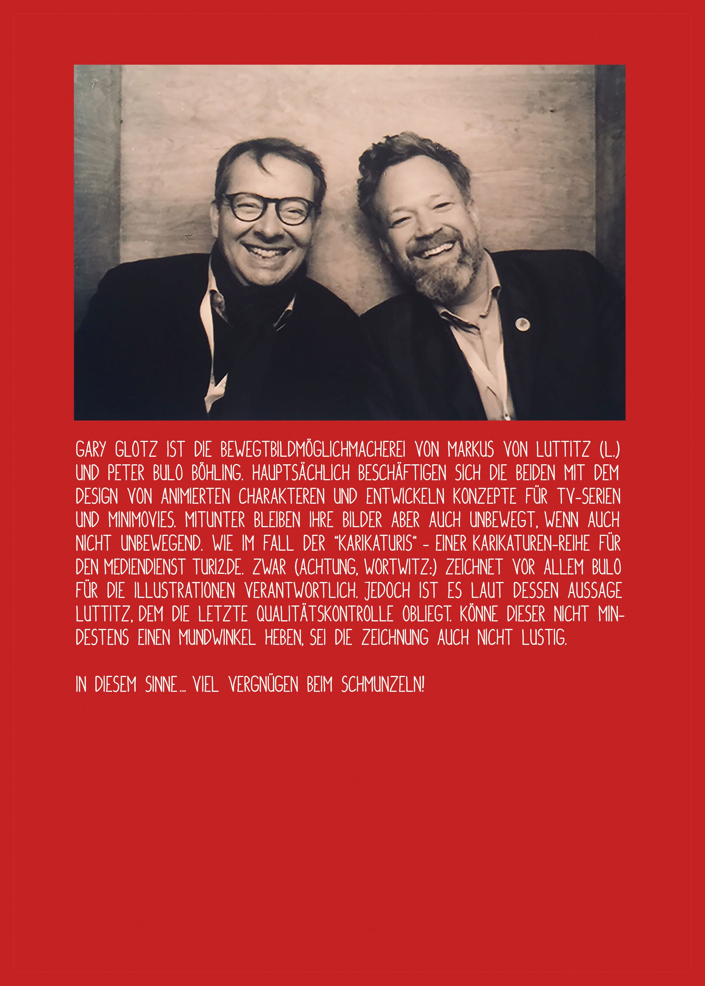 Gary Glotz ist die Bewegtbildmöglichmacherei von Markus von Luttitz und Peter Bulo Böhling. Hauptsächlich beschäftigen sich die beiden mit dem Design von animierten Charakteren und entwickeln Konzepte für TV-Serien und Minimovies. Mitunter bleiben ihre Bilder aber auch unbewegt, wenn auch nicht unbewegend. Wie im Fall der "Karikaturis" - einer Karikaturen-Reihe für den Mediendienst turi2.de. Zwar (Achtung, Wortwitz:) zeichnet vor allem Bulo für die Illustrationen verantwortlich. Jedoch ist es laut dessen Aussage Luttitz, dem die letzte Qualitätskontrolle obliegt. Könne dieser nicht mindestens einen Mundwinkel heben, sei die Zeichnung auch nicht lustig.In diesem Sinne ... Viel Vergnügen beim Schmunzeln!Mit einem Vorwort von Peter Turi.