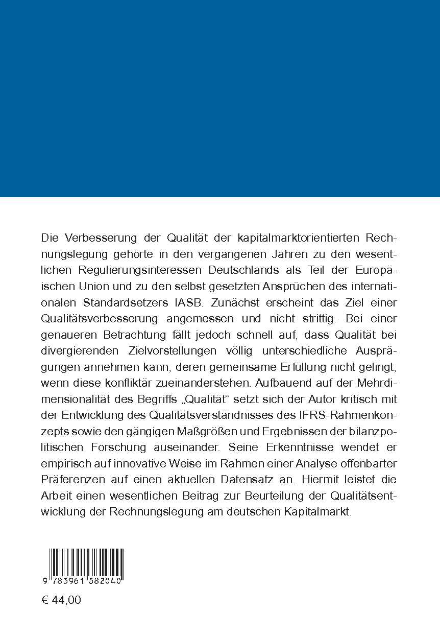 Die Verbesserung der Qualität der kapitalmarktorientierten Rechnungslegung gehörte in den vergangenen Jahren zu den wesentlichen Regulierungsinteressen Deutschlands als Teil der Europäischen Union und zu den selbst gesetzten Ansprüchen des internationalen Standardsetzers IASB. Zunächst erscheint das Ziel einer Qualitätsverbesserung angemessen und nicht strittig. Bei einer genaueren Betrachtung fällt jedoch schnell auf, dass Qualität bei divergierenden Zielvorstellungen völlig unterschiedliche Ausprägungen annehmen kann, deren gemeinsame Erfüllung nicht gelingt, wenn diese konfliktär zueinanderstehen. Aufbauend auf der Mehrdimensionalität des Begriffs „Qualität“ setzt sich der Autor kritisch mit der Entwicklung des Qualitätsverständnisses des IFRS-Rahmenkonzepts sowie den gängigen Maßgrößen und Ergebnissen der bilanzpolitischen Forschung auseinander. Seine Erkenntnisse wendet er empirisch auf innovative Weise im Rahmen einer Analyse offenbarter Präferenzen auf einen aktuellen Datensatz an. Hiermit leistet die Arbeit einen wesentlichen Beitrag zur Beurteilung der Qualitätsentwicklung der Rechnungslegung am deutschen Kapitalmarkt.