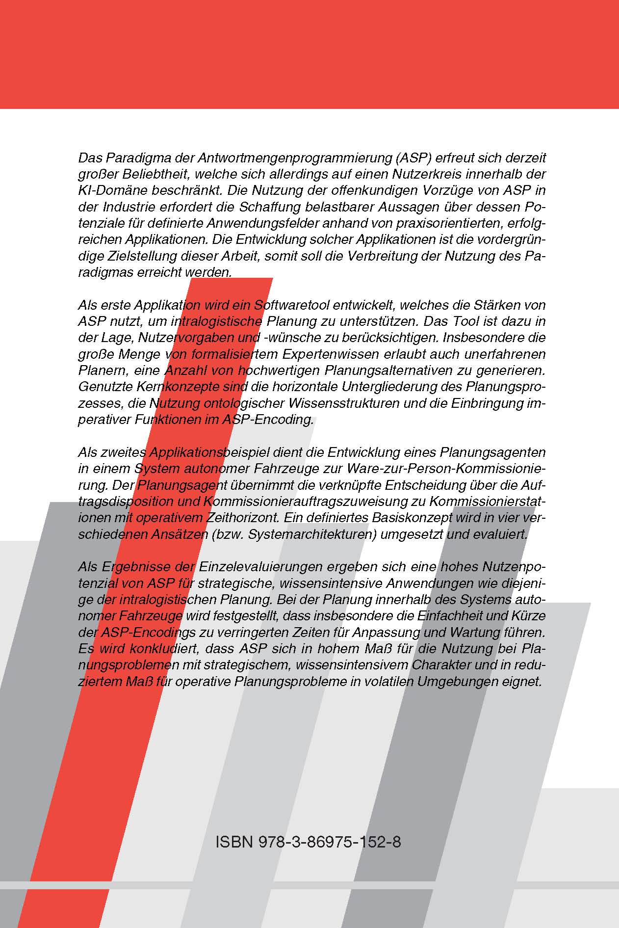 Als Ergebnisse der Einzelevaluierungen ergeben sich eine hohes Nutzenpotenzial von ASP für strategische, wissensintensive Anwendungen wie diejenige der intralogistischen Planung. Bei der Planung innerhalb des Systems autonomer Fahrzeuge wird festgestellt, dass insbesondere die Einfachheit und Kürze der ASP-Encodings zu verringerten Zeiten für Anpassung und Wartung führen. Es wird konkludiert, dass ASP sich in hohem Maß für die Nutzung bei Planungsproblemen mit strategischem, wissensintensivem Charakter und in reduziertem Maß für operative Planungsprobleme in volatilen Umgebungen eignet.