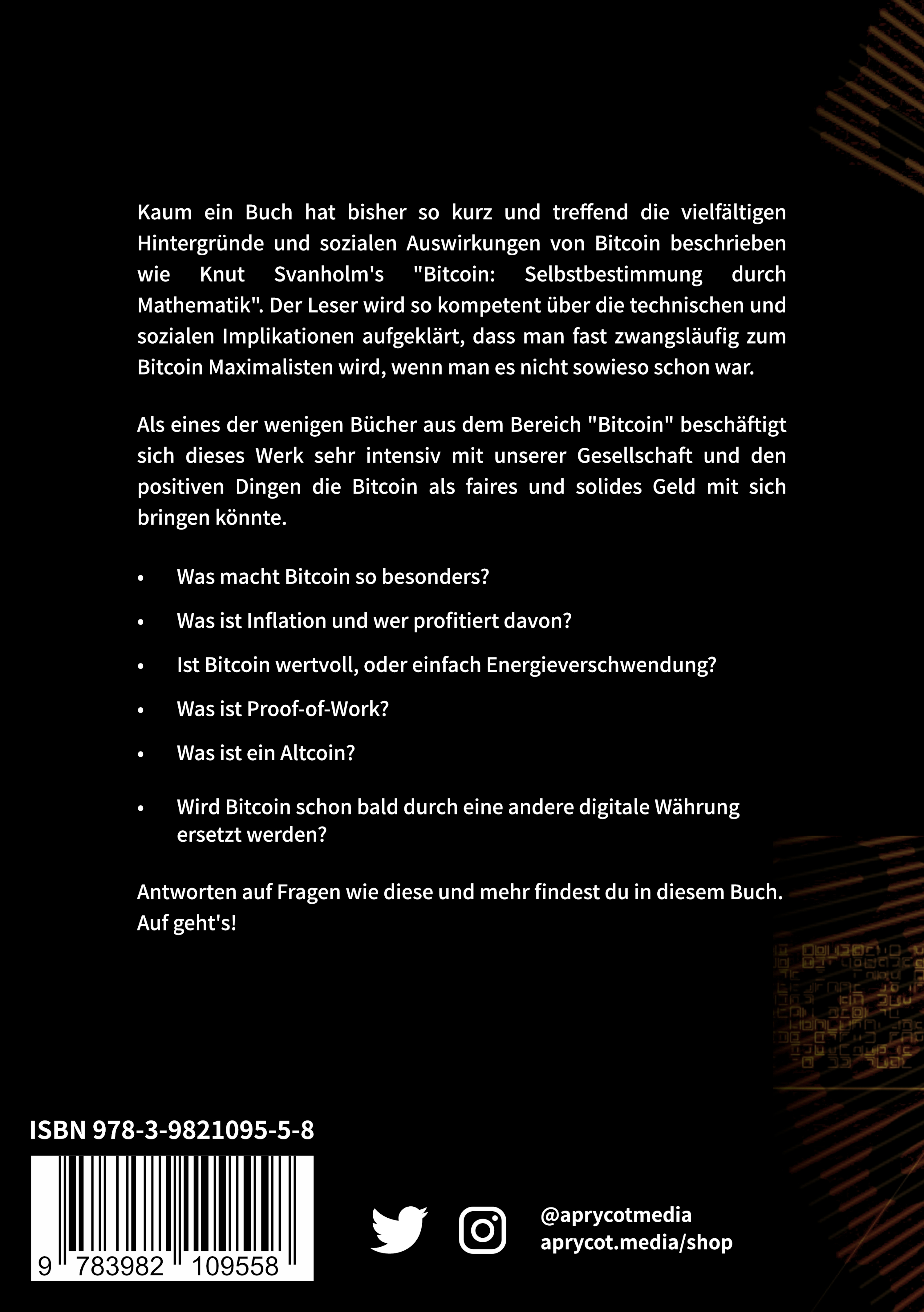 Kaum ein Buch hat bisher so kurz und treffend die vielfältigen Hintergründe und sozialen Auswirkungen von Bitcoin beschrieben wie Knut Svanholm's "Bitcoin: Selbstbestimmung durch Mathematik". Der Leser wird so kompetent über die technischen und sozialen Implikationen aufgeklärt, dass man fast zwangsläufig zum Bitcoin Maximalisten wird, wenn man es nicht sowieso schon war.Als eines der wenigen Bücher aus dem Bereich "Bitcoin" beschäftigt sich dieses Werk sehr intensiv mit unserer Gesellschaft und den positiven Dingen die Bitcoin als faires und solides Geld mit sich bringen könnte.