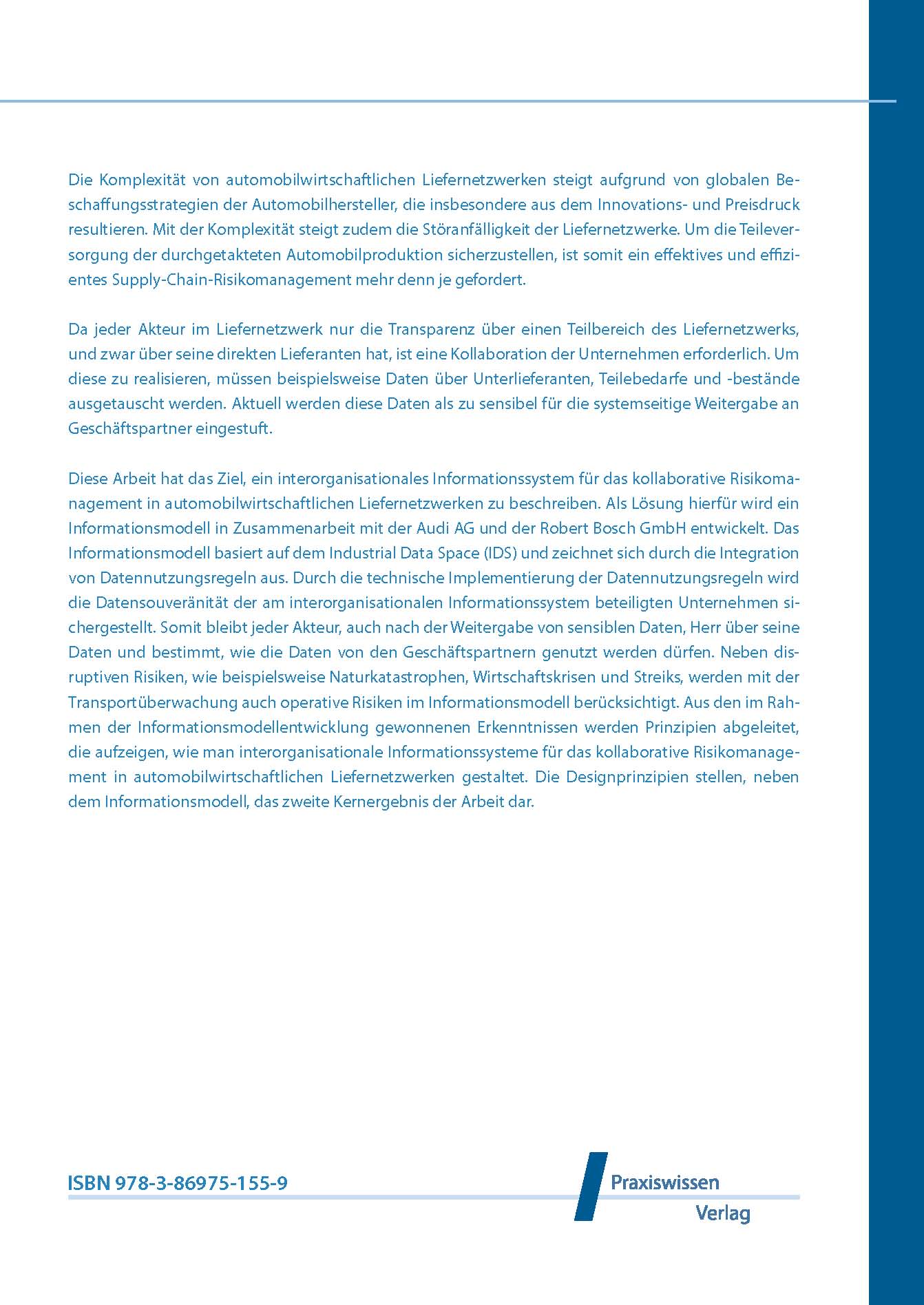 Diese Arbeit hat das Ziel, ein interorganisationales Informationssystem für das kollaborative Risikomanagement in automobilwirtschaftlichen Liefernetzwerken zu beschreiben. Als Lösung hierfür wird ein Informationsmodell in Zusammenarbeit mit der Audi AG und der Robert Bosch GmbH entwickelt. Das Informationsmodell basiert auf dem Industrial Data Space (IDS) und zeichnet sich durch die Integration von Datennutzungsregeln aus. Durch die technische Implementierung der Datennutzungsregeln wird die Datensouveränität der am interorganisationalen Informationssystem beteiligten Unternehmen sichergestellt. Somit bleibt jeder Akteur, auch nach der Weitergabe von sensiblen Daten, Herr über seine Daten und bestimmt, wie die Daten von den Geschäftspartnern genutzt werden dürfen. Neben disruptiven Risiken, wie beispielsweise Naturkatastrophen, Wirtschaftskrisen und Streiks, werden mit der Transportüberwachung auch operative Risiken im Informationsmodell berücksichtigt. Aus den im Rahmen der Informationsmodellentwicklung gewonnenen Erkenntnissen werden Prinzipien abgeleitet, die aufzeigen, wie man interorganisationale Informationssysteme für das kollaborative Risikomanagement in automobilwirtschaftlichen Liefernetzwerken gestaltet. Die Designprinzipien stellen, neben dem Informationsmodell, das zweite Kernergebnis der Arbeit dar.