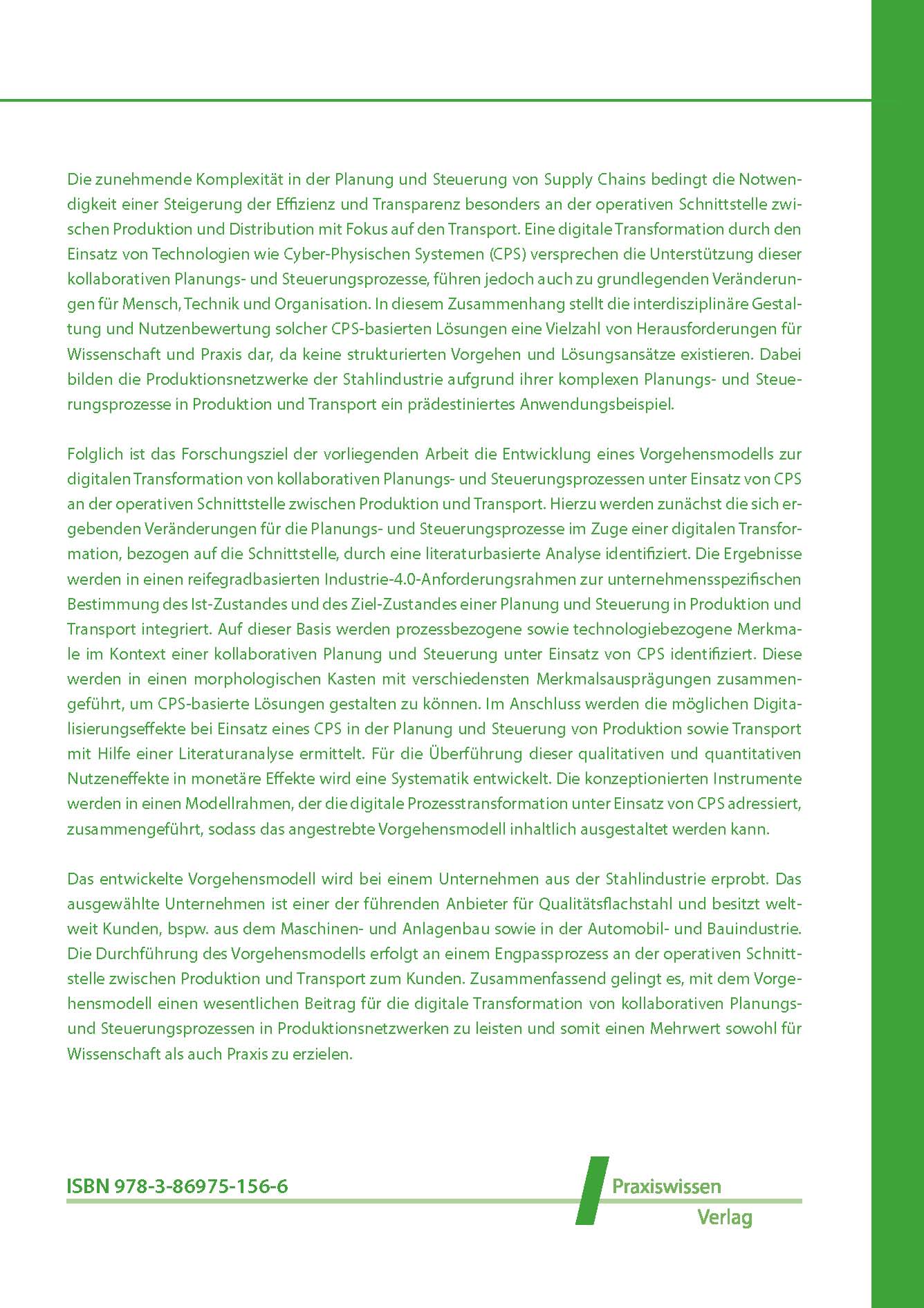 | Schlagworte | Cyber-physisches System • digitale Transformation • Industrie 4.0 • Kollaborative Planung • Nutzenbewertung • Produktionsplanung und -steuerung • Stahlindustrie • Supply Chain Management • Transportplanung und -steuerung • Vorgehensmodell |