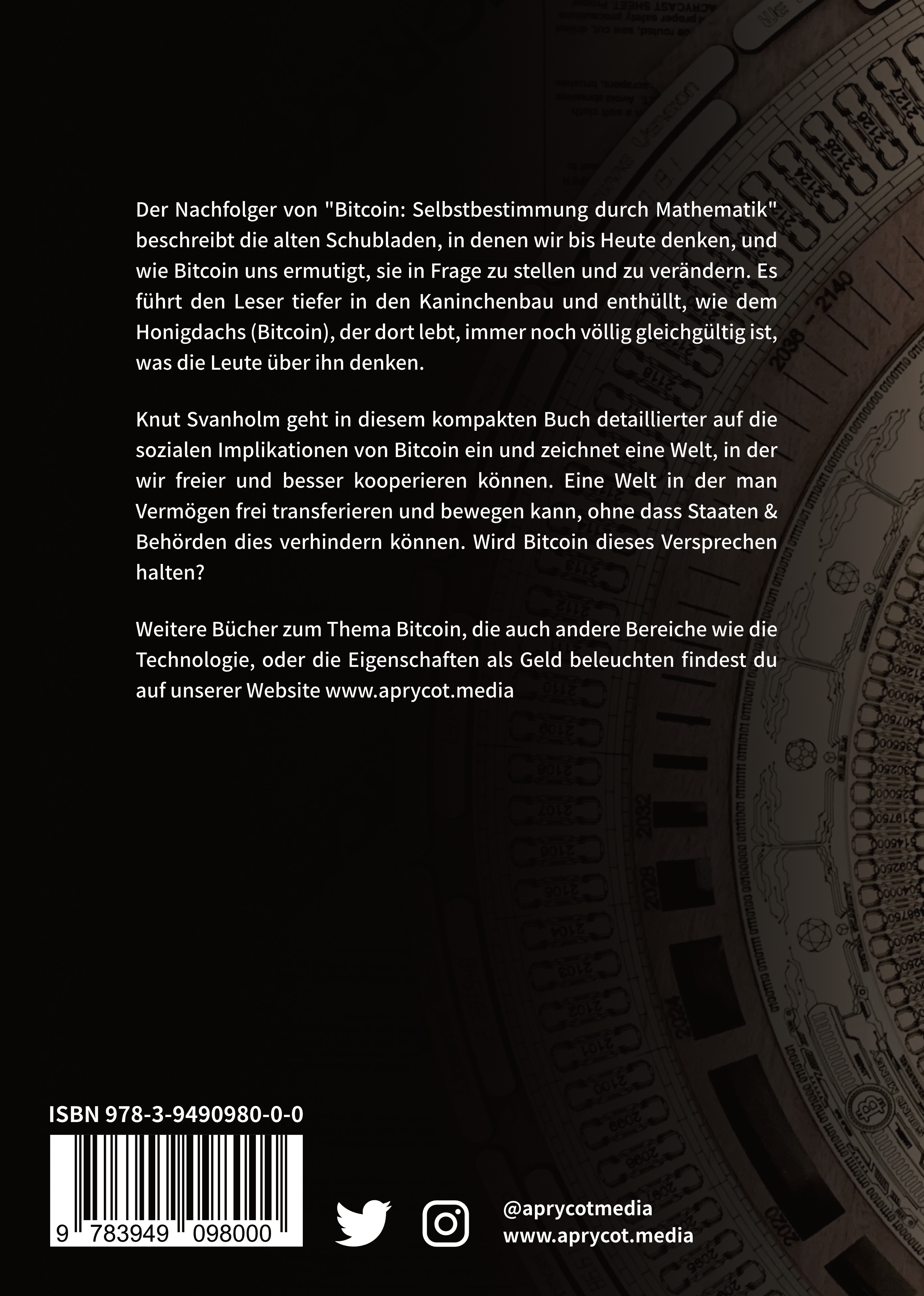 Der Nachfolger von "Bitcoin: Selbstbestimmung durch Mathematik" beschreibt die alten Schubladen, in denen wir bis Heute denken, und wie Bitcoin uns ermutigt, sie in Frage zu stellen und zu verändern. Es führt den Leser tiefer in den Kaninchenbau und enthüllt, wie dem Honigdachs (Bitcoin), der dort lebt, immer noch völlig gleichgültig ist, was die Leute über ihn denken.Knut Svanholm geht in diesem kompakten Buch detaillierter auf die sozialen Implikationen von Bitcoin ein und zeichnet eine Welt, in der wir freier und besser kooperieren können. Eine Welt in der man Vermögen frei transferieren und bewegen kann, ohne dass Staaten & Behörden dies verhindern können. Wird Bitcoin dieses Versprechen halten?